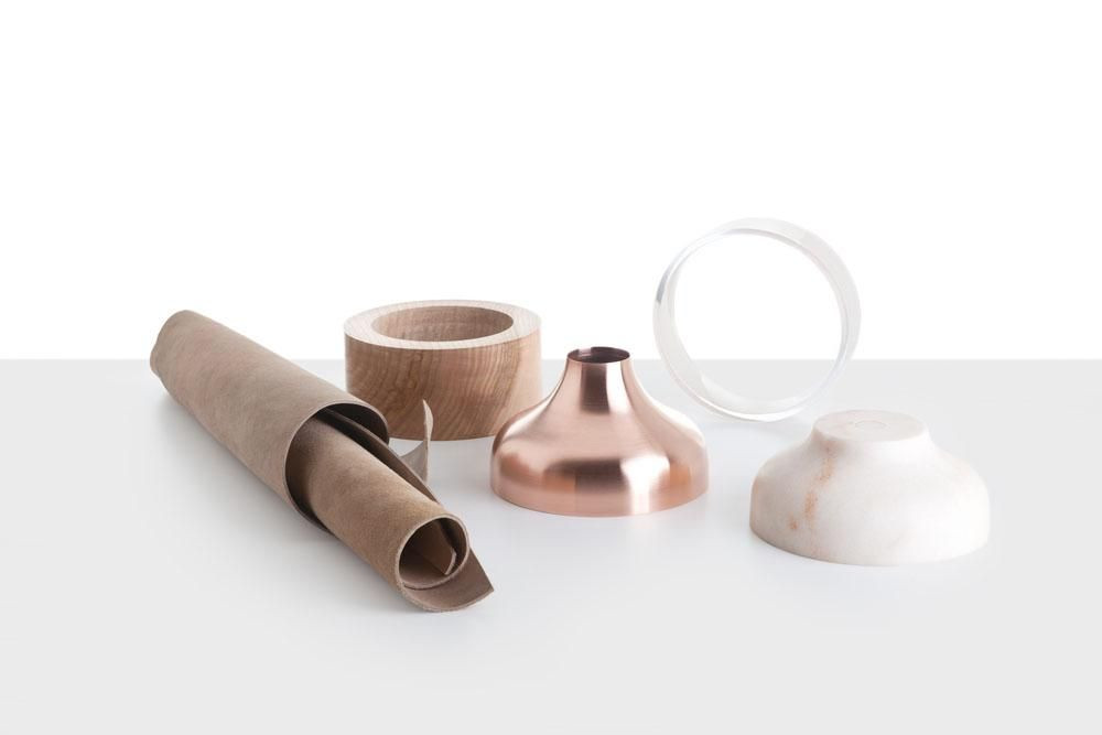Váza je vyrobena ze dřeva, mědi, kůže, skla a mramoru. Každý materiál dává váze svůj odlišný a nezaměnitelný charakter. V duchu jednoduché formy váz Z jedné se materiály a řemesla tvořící historii designu potkávají na jediném místě, v jediném tvaru.