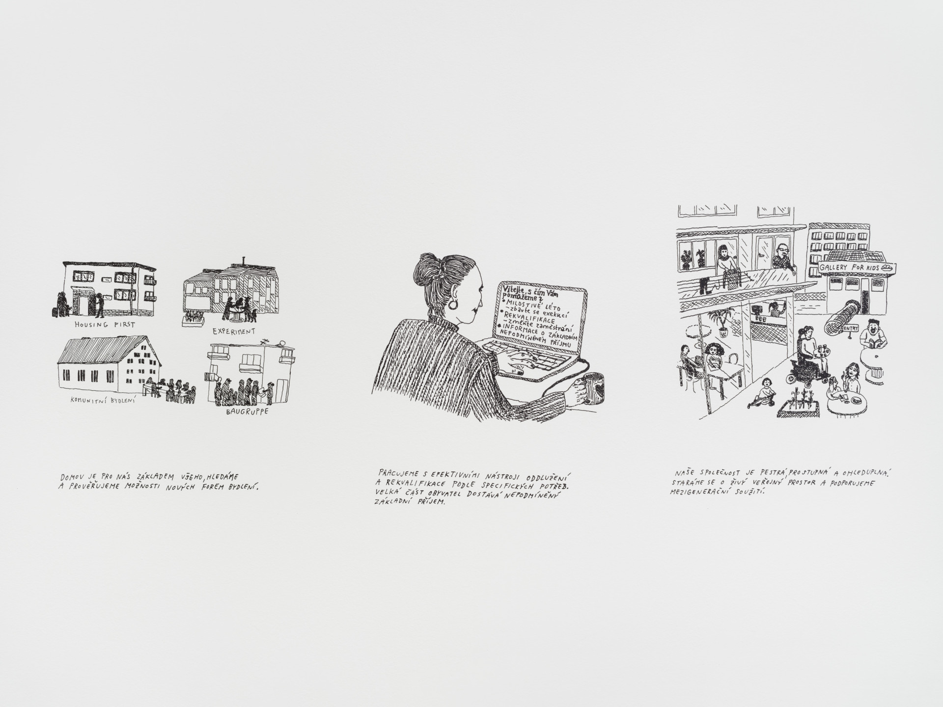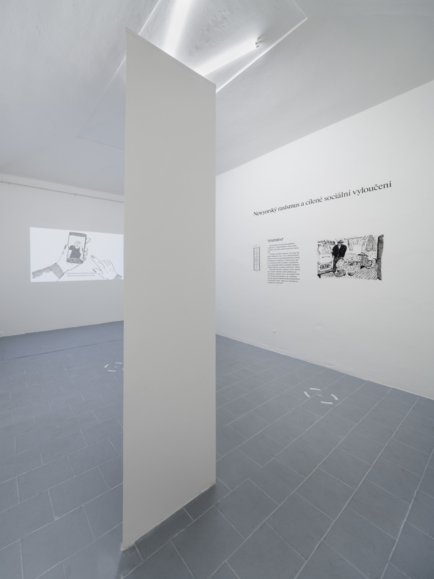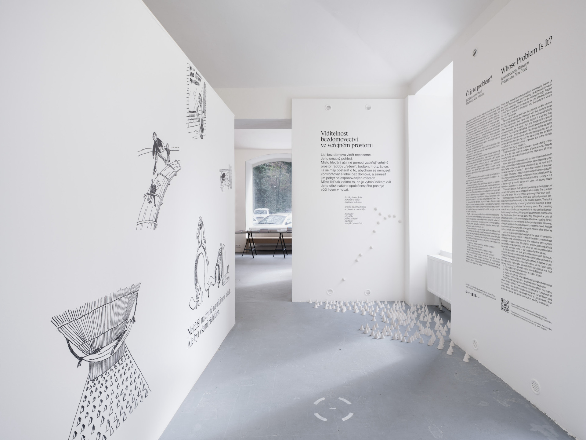 Na bezdomovectví a bytovou nouzi nahlížíme v této výstavě skrze čtyři tematické oblasti, které čerpají jak z českého (evropského), tak newyorského (amerického) kontextu, přičemž hlubší poznání situace v New Yorku nám dává možnosti pochopit širší souvislosti sociální problematiky a díky tomu změnit trajektorii vývoje u nás v Evropě: