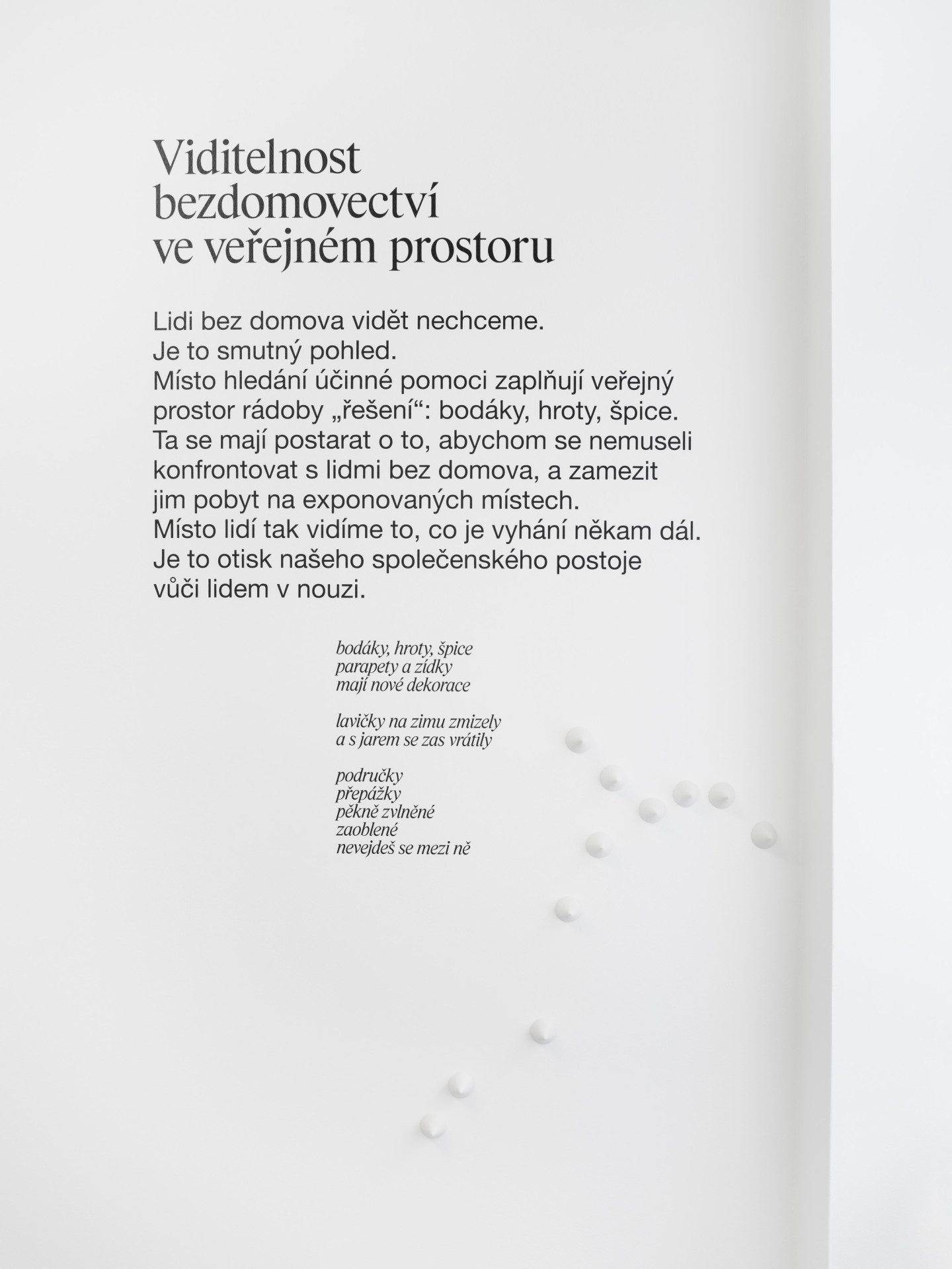 Když zkoumáme, proč někdo nemá kam jít večer spát, nutně si začneme klást neodbytné otázky. Jaké uznáváme hodnoty? Jaký máme vztah k nejslabším členům společnosti? Jak se to projevuje ve veřejném prostoru? Jaký vliv má prostředí na člověka? Kolik máme segregovaných oblastí a lidí v sociálním vyloučení? Jsme rasisté? Jaký máme postoj k bydlení – je to právo nebo zásluha? Vytváří si naše společnost lidi bez domova sama?