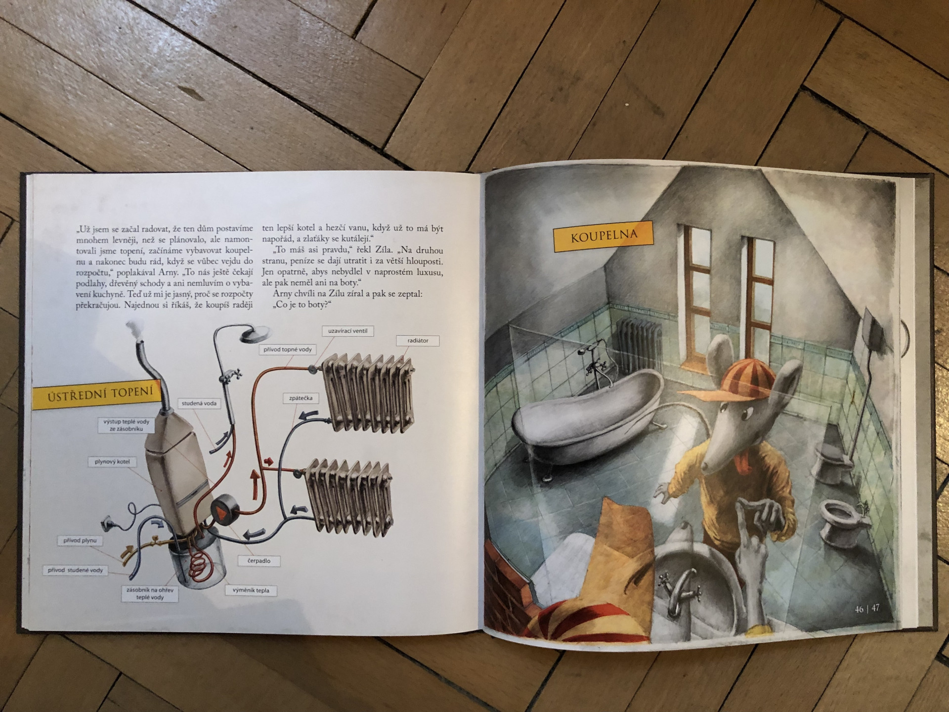 Co ovšem Kryštof oceňuje, je podrobně popsaný proces stavby. „Tohle by mě bavilo,“ ukazuje na stránku, kde pracují elektrikáři. Je tu i detailní nákres vypínače. „Tady je plus a tady mínus a tady je nulák,“ ukazuje – probudil se v něm technik. Podobně ocení schéma ústředního topení nebo lešení.