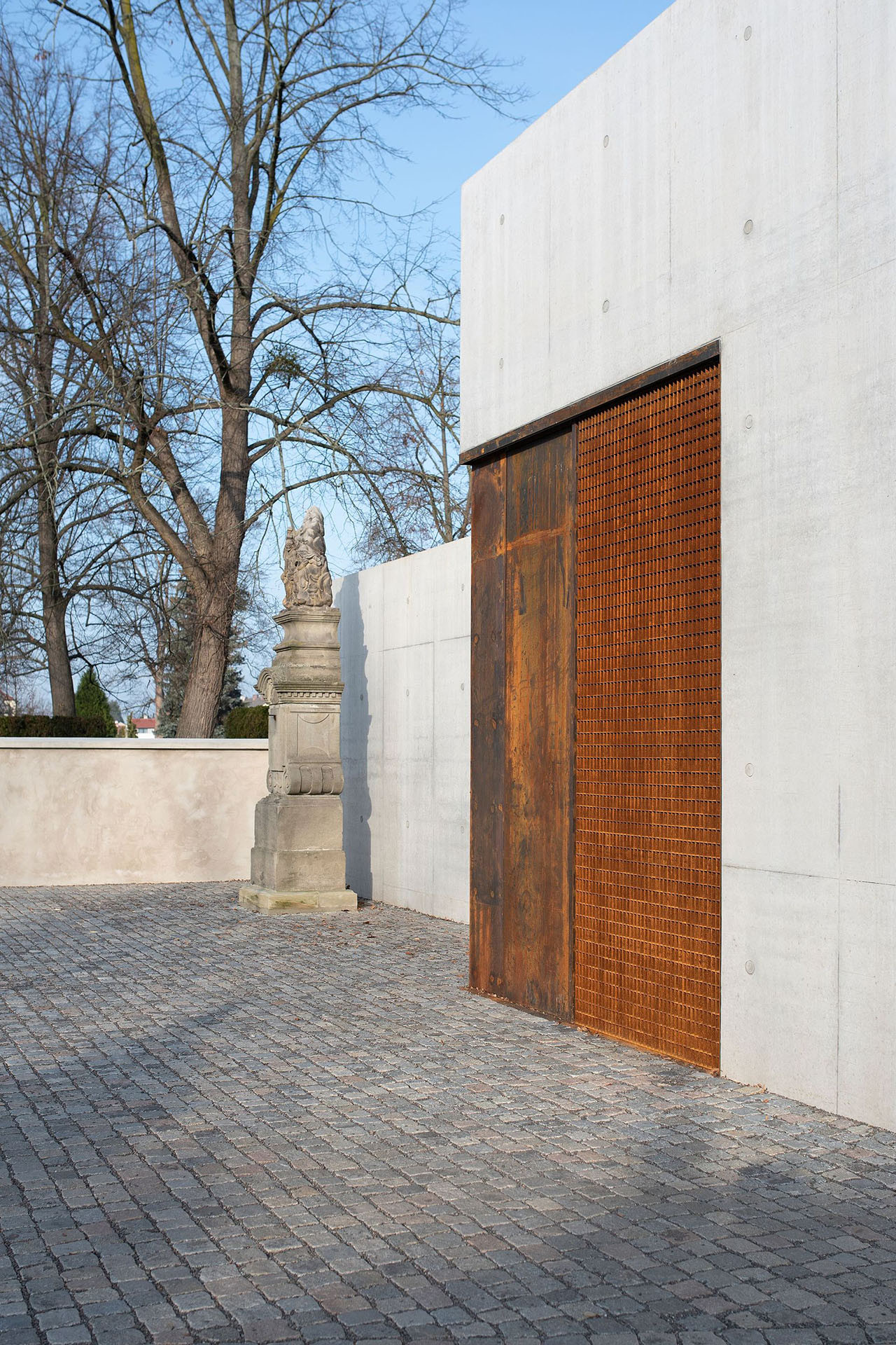 Blížíme se k jižnímu vstupu na hřbitov. Dvě monolitické betonové krychle se před námi objeví znenadání. Vidíme, že jde o soudobý zásah do prostředí. Všímáme si, že vizuálně jsou tyto dvě stavby skutečně povedené. Ale přeci – nestrhávají na sebe přílišnou pozornost. V hlavní roli zůstávají náhrobky za branou. Soudobá architektura vyjadřuje pohřbeným respekt.