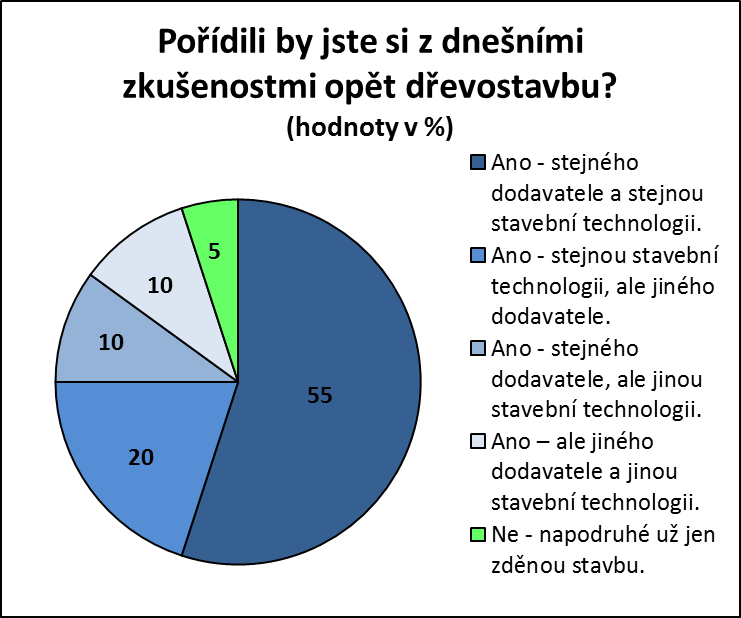 Graf 01 dokazuje, že 95 % uživatelů by i napodruhé chtělo dřevostavbu: z toho 55 % uživatelů dřevostaveb je zcela spokojeno s dodavatelem i stavební technologií, 20 % spokojeno pouze se stavební technologií, polovina z toho 10 % naopak spokojena jen s dodavatelem a zbývajících 10 % nespokojených s dodavatelem i stavební technologií zůstává dále věrno dřevostavbě. Pouhých 5 % uživatelů (tj. každý dvacátý) by už napodruhé upřednostnilo zděnou stavbu.