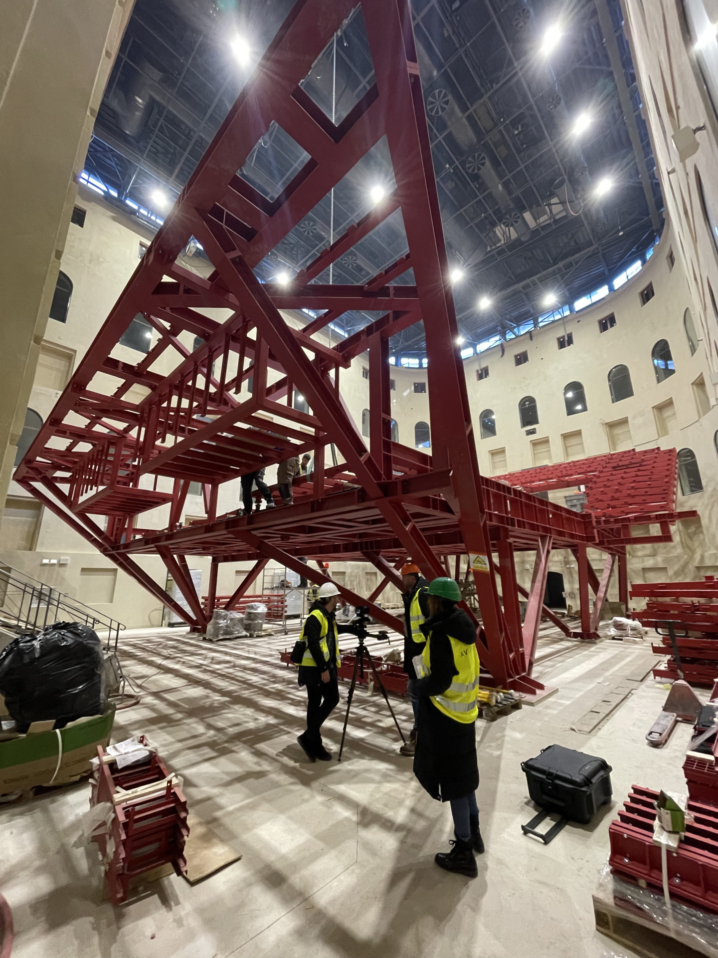 Při statickém posouzení betonového balkonu hlavního foyeru se ukázalo, že bude nutné konstrukci podepřít nebo zavěsit. Mně se to nejdřív nelíbilo, ale pak mě napadlo, že by se táhla mohla použít jako struny, které by se pak daly šroubením vypnout a vyladit. Umístili jsme jich tam víc, než bylo potřeba, abychom získali různé délky pro různý frekvenční rozsah. Celá budova se tak stala ozvučnicí, hudebním nástrojem rozeznívaným skrze tyto struny. To jsme později využili při interpretaci skladby s názvem 15 minut a 15 vteřin ve městě Galegion, která se hrála podle partitury vzniklé transformací architektonických výkresů.