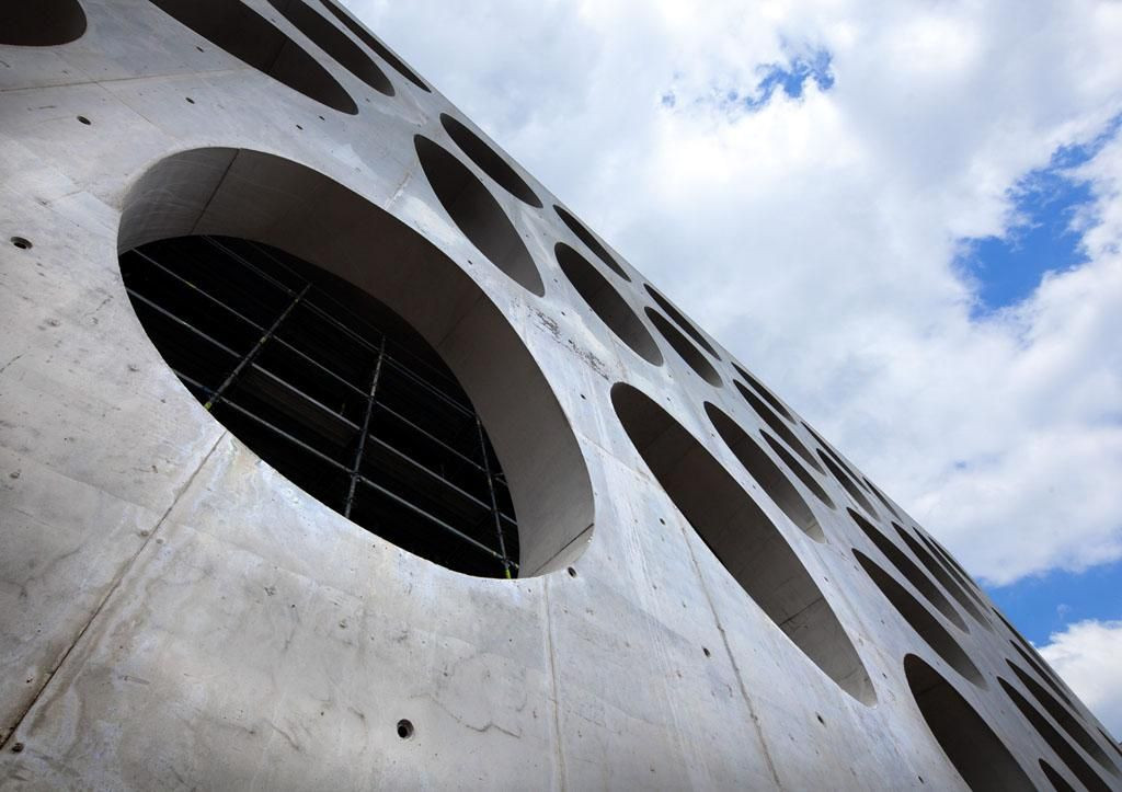 Perforovaná čelní fasáda, která je pojata jako architektonická reinterpretace divadelní opony, je největší betonovou skulpturou v ČR.