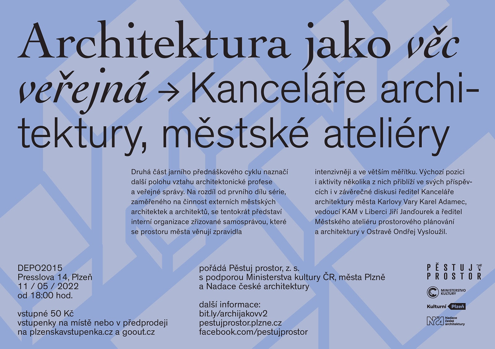„Zatímco v první části cyklu jsme přivedli do Plzně externí městské architektky a architekty věnující práci pro město zpravidla jen část své pracovní aktivity, v rámci druhého dílu představíme interní organizace zřizované samosprávou: kanceláře architektury města a městské ateliéry,“ uvádí dramaturg série Petr Klíma z pořádajícího spolku. Tato koncepční pracoviště zpravidla tvoří vizi budoucího prostorového rozvoje daných měst a prostoru měst se věnují intenzivněji a ve větším měřítku. V Plzni fungování svých organizací přiblíží ředitel Kanceláře architektury města Karlovy Vary Karel Adamec, vedoucí KAM v Liberci Jiří Janďourek a ředitel Městského ateliéru prostorového plánování a architektury v Ostravě Ondřej Vysloužil.