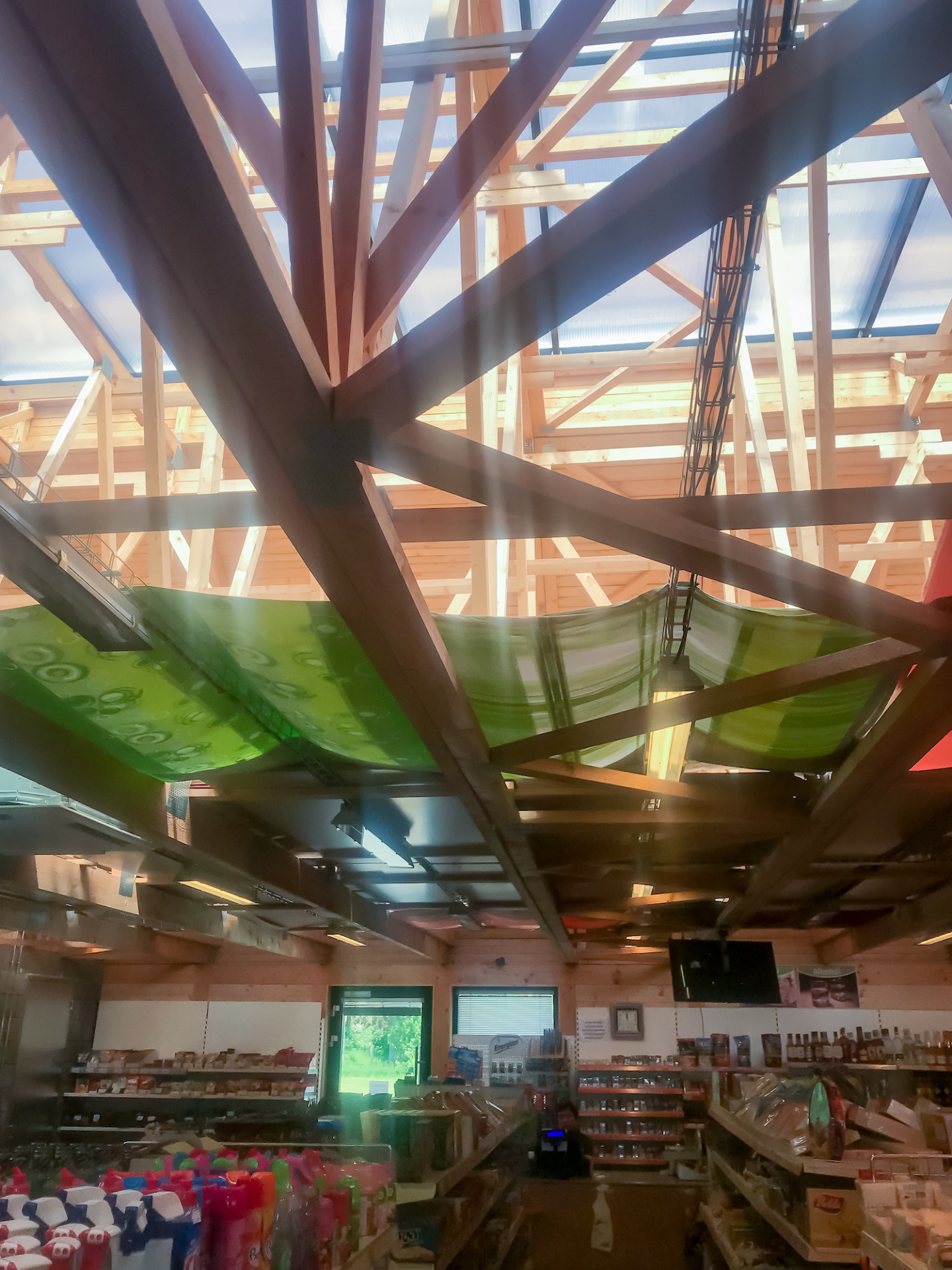 Architektonický koncept se opírá právě o osvětlení střešním otvorem. Tradičně má sice mít obchod úpravné výkladce, ale správný obchodník na ně nevěří. Radši je zalepí a regály pěkně po obvodu, ať se tam vejde co nejvíc zboží. Architekti z toho udělali ústřední princip, výlohy nahradilo střešní okno a pod ním se otevírá efektní pohled do dřevěné konstrukce střechy.