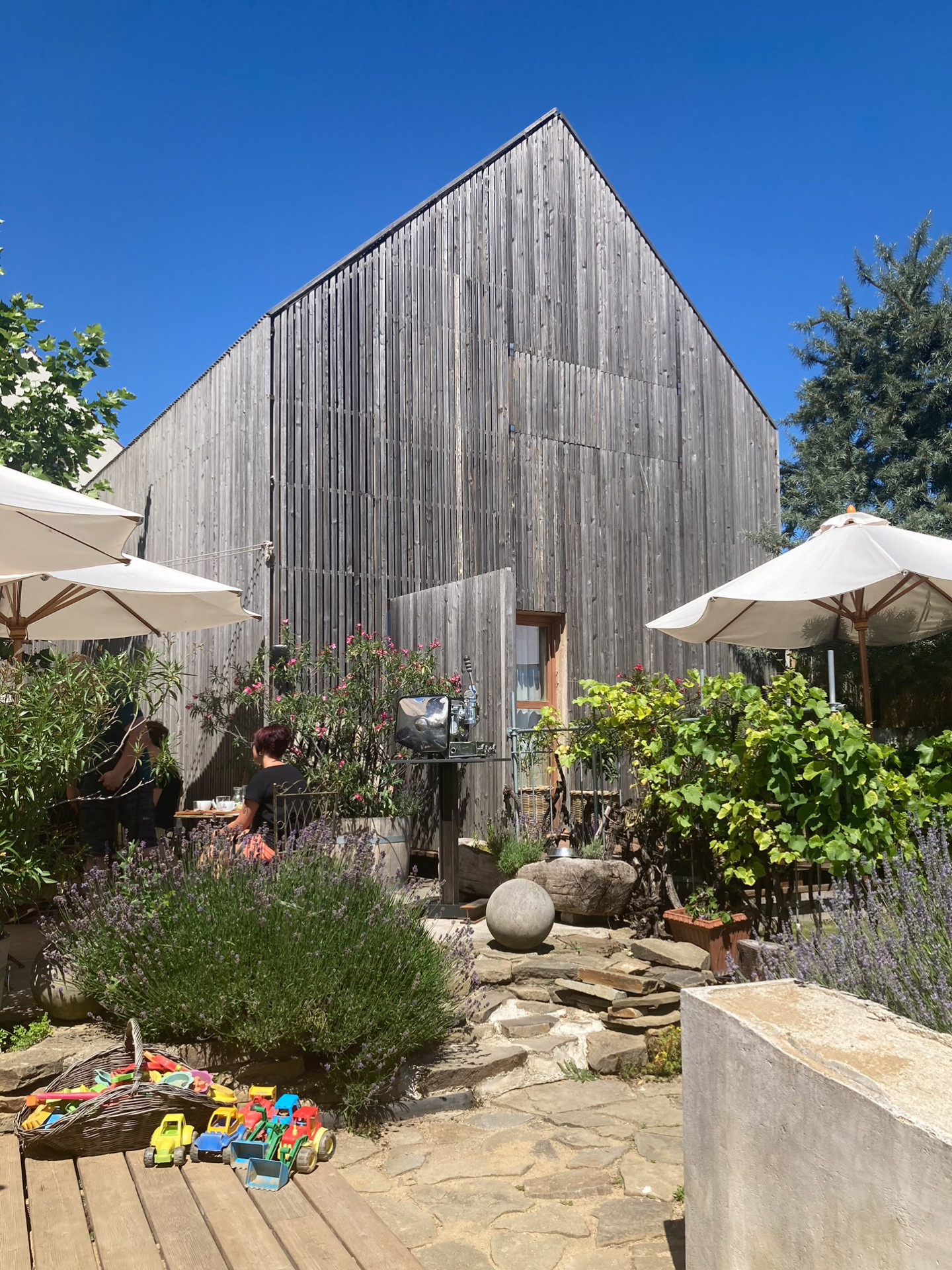Při procházení městem nás ještě náhodně překvapí odvážně současný černý rodinný domek se zelenou, napůl plochou a napůl šikmou, střechou a bazénem vysoko ve svahu nad ním. Bližší zkoumání odhalí pěkné detaily a průsvitnou boční stěnu z copilitu – kuráž tomuto domu rozhodně nechybí. V ulici je sice výrazný, nicméně ne na úkor domů ostatních. Vševědoucí internet nám prozrazuje, že za jeho návrhem stojí brněnští architekti Kuba&Pilař.