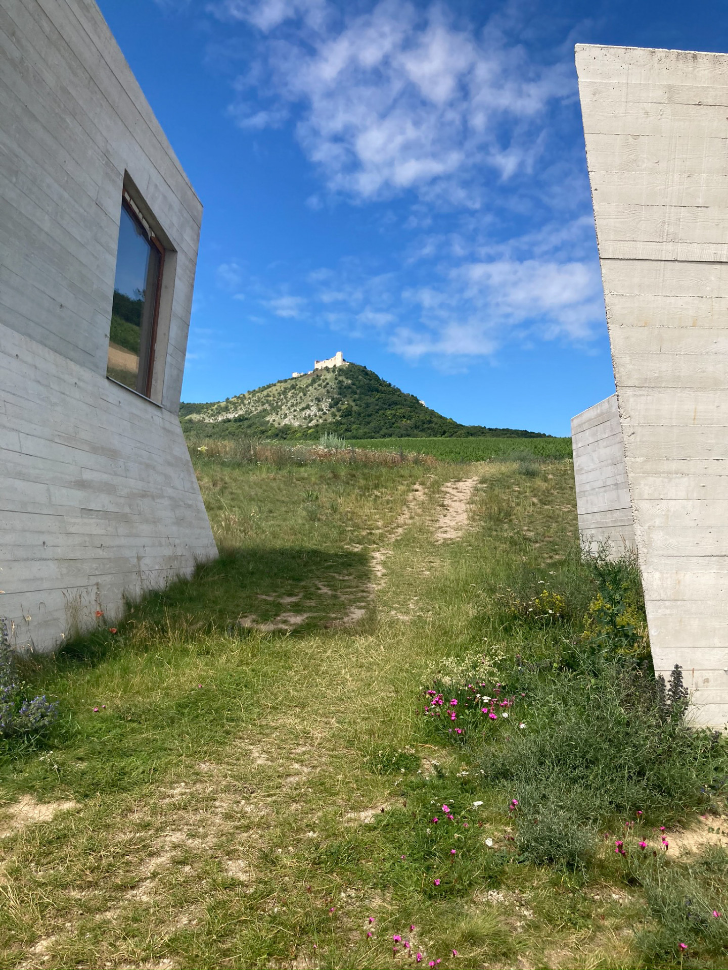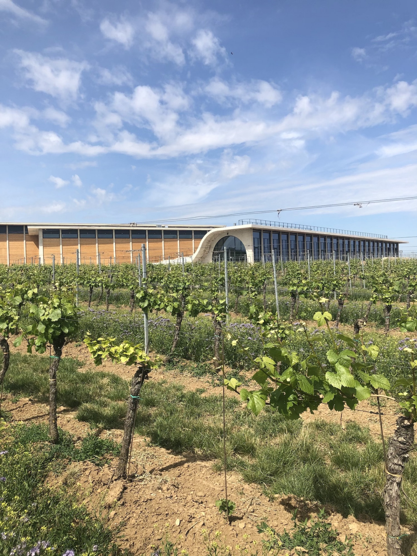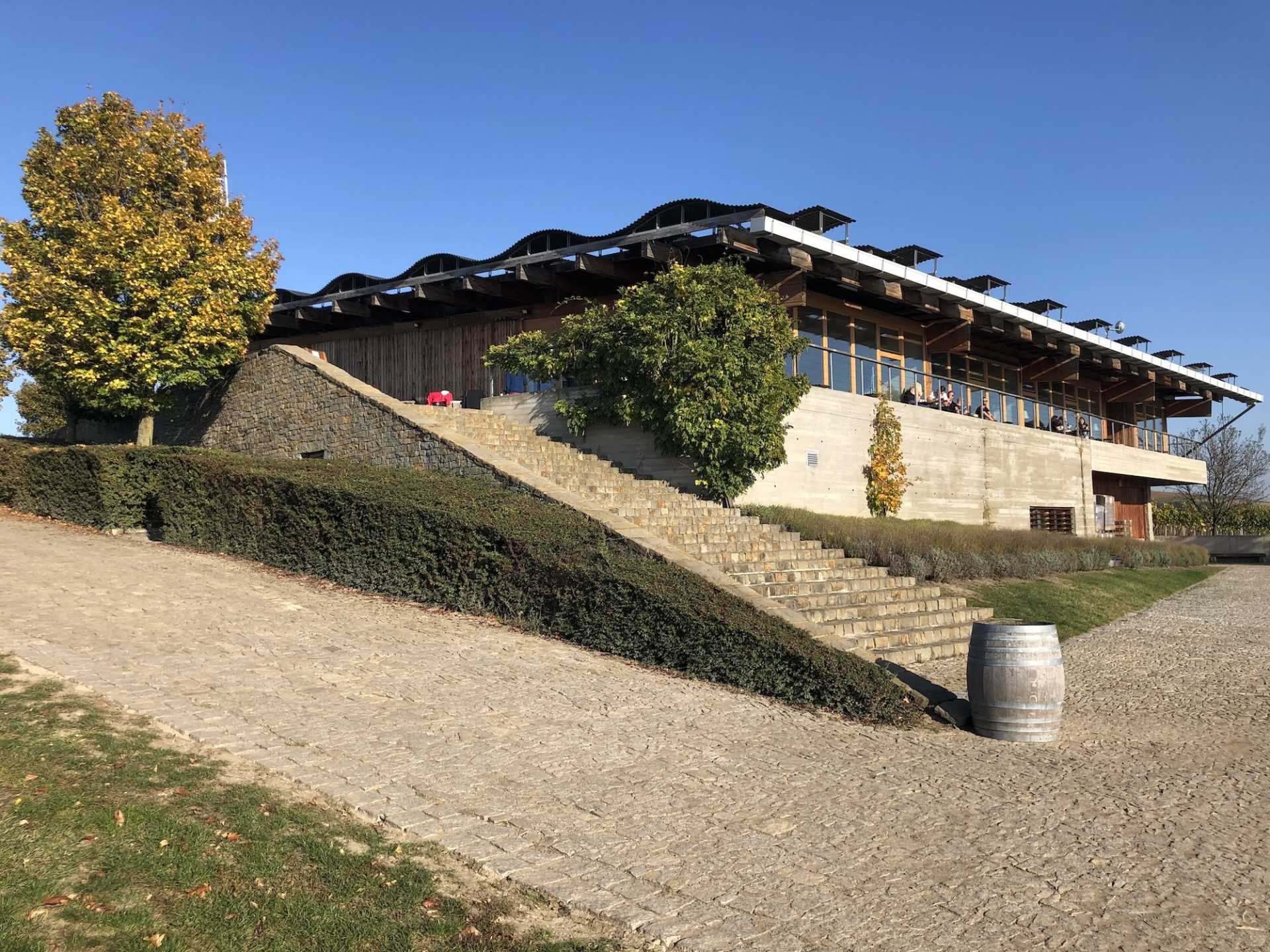Statečně odoláváme. Tedy… “Znojmo, vidím tě dvojmo,” zní nám v hlavě už od rána, a tak míříme rovnou do nově otevřeného vinařství Lahofer uprostřed vinic (kde taky jinde) v obci Dobšice kousek za městem. Z dálky poměrně strohá budova v klasické materiálové trojkombinaci dřevo-beton-sklo se při příchodu blíže otevírá a odhaluje efektní betonovou vlnu, která odděluje výrobní a návštěvnickou část. Proč ne. Mezi budovami vzniká jakýsi amfiteátr pro pořádání kulturních akcí a vystoupat můžete až na střechu. Tvar vlny navíc vychází z interiéru, kde vinárna svým zaklenutým stropem odkazuje k mnohem menším vinným sklípkům. Opět – proč ne, prostor uvnitř je příjemný a víno si vychutnáte s výhledem na rostoucí sazeničky vinné révy. Nápad na upgrade obvykle velmi utilitární výrobní budovy na stavbu s výraznou architektonickou a kulturní hodnotou prý vzešel přímo od architektů (Chybík a Krištof), kteří s investorem spolupracovali i na jiné zakázce (viz dále). A tahle volba se investorovi určitě vyplatila. Zájem návštěvníků je již nyní značný – my přijíždíme ráno na téměř prázdné parkoviště, než si ale stavbu projdeme a dáme si skleničku vína, je téměř zaplněno.