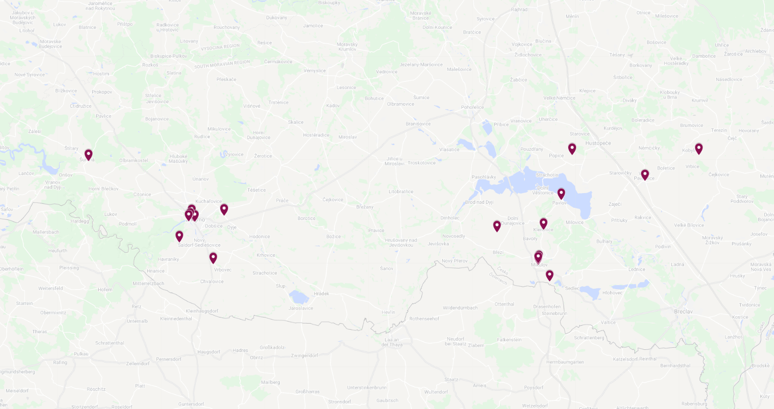 Interaktivní mapa všech navštívených míst vám umožní snadné naplánování cesty po architektuře jižní Moravy