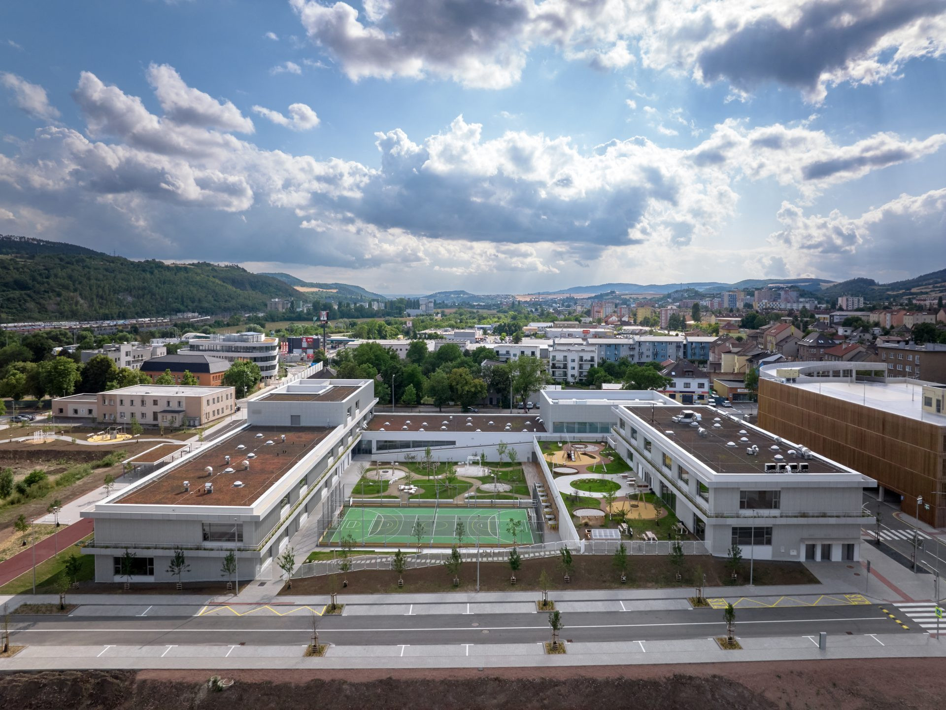 Projekt ateliéru OVA vznikl na základě soutěže. Na pozemku o 30 tisících metrech čtverečních vytvořili nejen budovu školy, ale i nové náměstí. Třípodlažní objekt se dvěma dvory kombinuje klasické učebny s množstvím alternativních prostor – od venkovních tříd na střechách, přes pobytová atria s velkými schodišti až po keramické a polytechnické dílny. Zcela výjimečný je i padesátimetrový atletický tunel zapuštěný do podzemí, který uvolňuje na povrchu místo pro sportoviště. Škola s kapacitou více než 800 dětí pracuje s principem otevřenosti a flexibility – nabízí různorodé scénáře pro výuku i volný čas a zároveň nastavuje měřítko pro budoucí urbanistický rozvoj celé lokality.