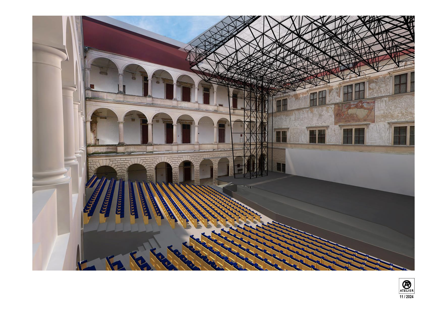 „Obzvlášť podstatné bylo, aby se nová architektura s tím zámkem spojovala, ale zároveň aby mu netvořila žádnou konkurenci, aby tam byla i nebyla,“ řekl Josef Pleskot České televizi. Sál je navržený jako mobilní a v nádvoří zámku bude vždy jen po dobu festivalu, který každoročně probíhá v červnu a červenci. Vestavba je navržena tak, aby se stěn zámku vůbec nedotýkala. Skládat se bude z jeviště, hlediště a tribun, které budou přímo pod arkádami zámeckých ochozů. Hrát se v něm bude moct i za špatného počasí – v případě deště otevřené nádvoří zatáhne mobilní střecha.