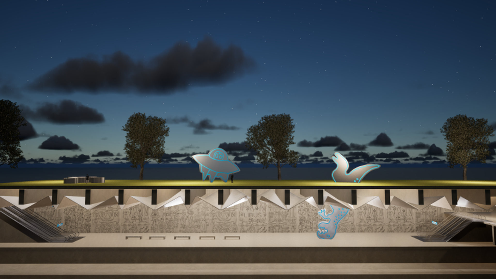 Stanice metra D Libuš bude mít svého dinosaura. Promění se v hravou jeskyni plnou ornamentálních reliéfů s výraznou dinosauří sochou prorůstající z nástupiště až na povrch. Autory výtvarného návrhu, který zvítězil v soutěži, jsou Julius Reichel, Roman Výborný a Roel Jeroen van der Linden. Ornamentální kresby budou frézovány přímo do obkladů a jejich témata vzniknou i ve spolupráci s místními obyvateli.