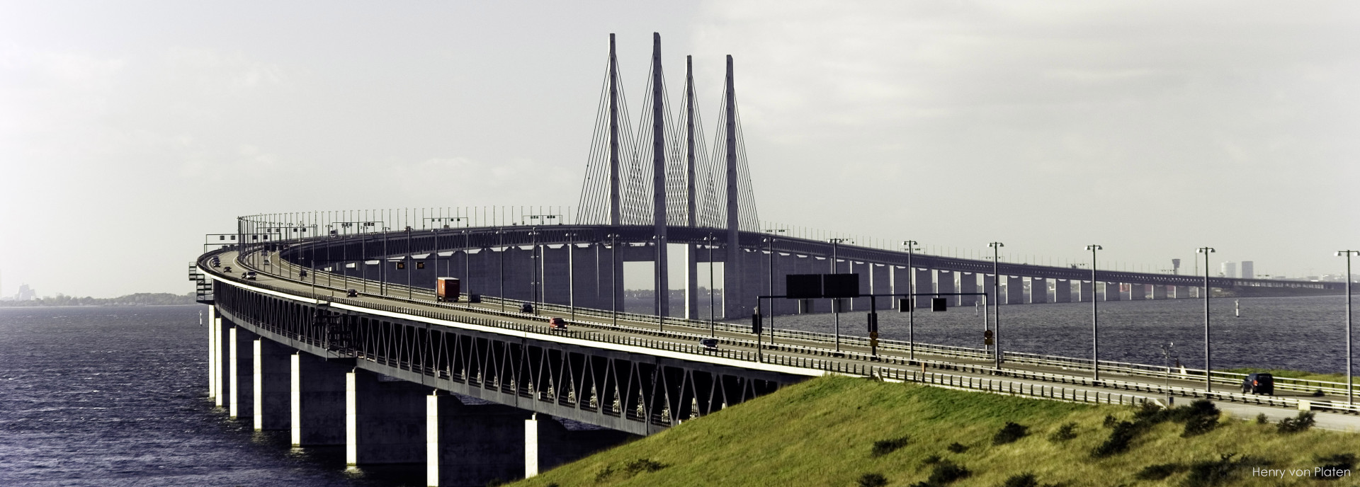 Foto: Öresundský most z Dánska do Švédska. Vpravo umělý ostrov Peberholm a vlevo Saltholm. Zobrazené ostrovy patří Dánsku. Na obzoru je vidět švédské město Malmö.
