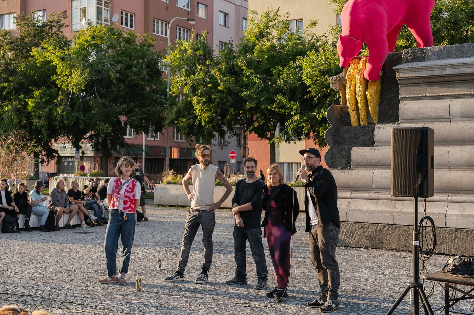 Sousoší vzniklo v rámci programu Umění pro město, který spadá pod Galerii hlavního města Prahy. Do otevřené soutěže se přihlásilo 45 autorů, vítězný návrh komise ocenila pro jeho propojení s geniem loci tržnice i zapamatovatelnou monumentalitu. Výrazné dílo růžové barvy v Holešovicích zůstane po dobu jednoho roku.