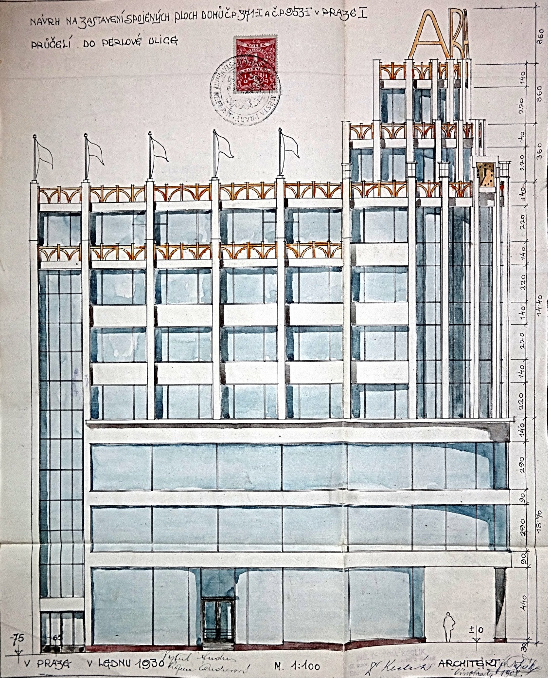 Výstavba paláce jako sídla obchodního domu firmy ARA (A. R. Amschelberg) probíhala v letech 1930-31. Návrh domu zpracoval významný pražský architekt Milan Babuška mezi lety 1927-28. Projekt ale v dalších fázích prošel změnami. Pozdější plány jsou podepsané pražským stavitelem Františkem Řehákem, proto se uvádí jména obou osobností.