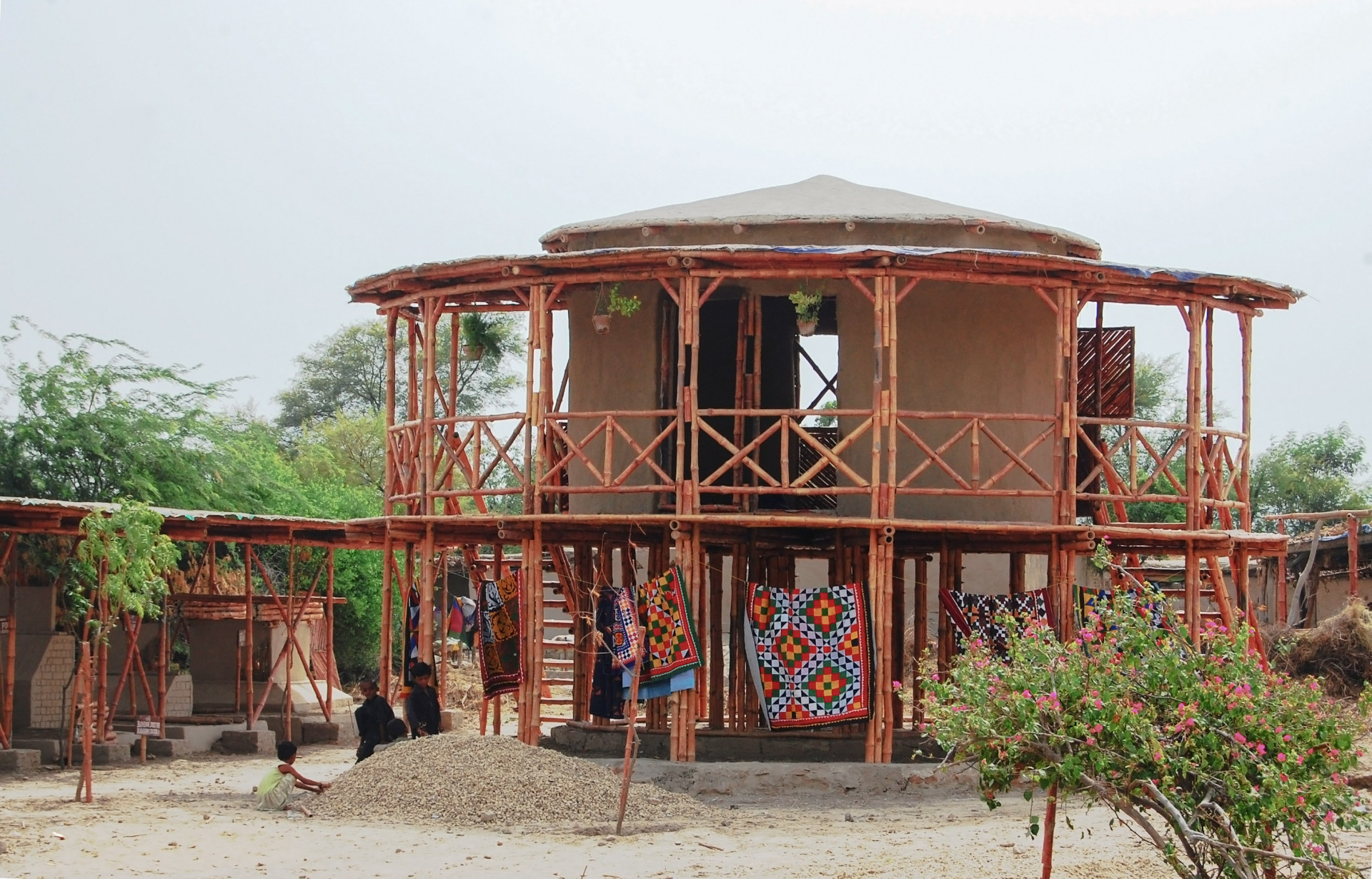 Když v roce 2022 Pákistán zasáhly neobvykle ničivé záplavy, které připravily o domov desítky milionů lidí, měla už Yasmeen Lari dvacetileté zkušenosti v oblasti humanitární a uhlíkově neutrální architektury. Dostala se k ní přitom poměrně netypickou cestou – skrze památkovou péči, ve které už v 80. letech začala pro rekonstrukce podporovat využívání lokálních a tradičních materiálů. Hlínu a vápno doporučovala i ke stavbě rodinných domů, v roce 2009 pak na seznam přidala ještě bambus – pro Pákistán invazivní rostlinný druh, který se v zemi hojně rozšířil.