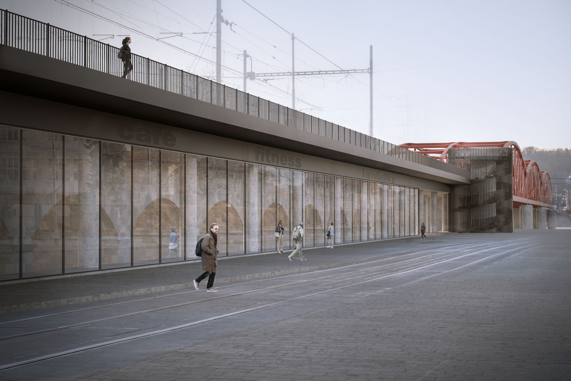 Na částečně vykonzolovanou železniční zastávku s nástupišti bude navazovat přednádražní prostor. Na protější straně ulice bude dotvořen dosud neukončený domovní blok. Celkovými úpravami vznikne přívětivé předmostí bez automobilové dopravy a křižovatek, v němž se časem rozvine nový život. Radikální zásah do automobilového provozu a jeho zjednodušení umožní vytvoření kompaktního, zklidněného prostředí pro setkávání a pobyt Pražanů.