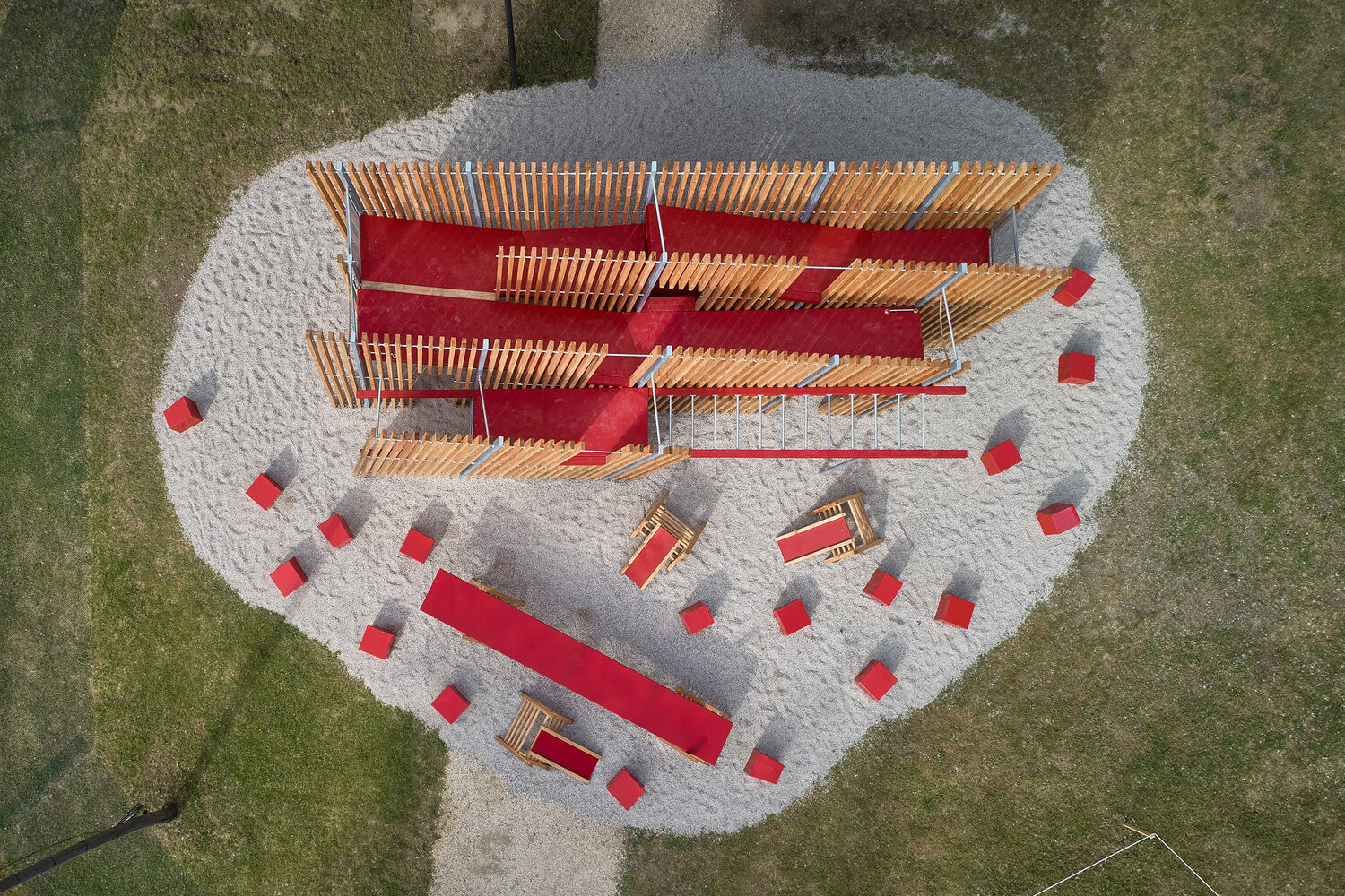 Tohle je nejkrásnější prostor celého Giardini. A přitom tu vlastně jen ukazují příkladné hospodaření s dešťovou vodou. Zachycují ji, filtrují, zalévají s ní bylinky a pak z ní pro návštěvníky vaří čaj. Vody, která tu naprší, je ovšem překvapivě hodně, proudí pavilonem jako potok, který návštěvníci překračují. Expozice nabízí jednak vzkaz, že ve využití deště máme rezervy, jednak architektonický prostor, který „nám připomene, jak architektura jako umělecká disciplína dokáže udělat neviditelné viditelným,“ píše se v úvodním textu. Autory instalace je studio Lundgaard & Tranberg Architects.