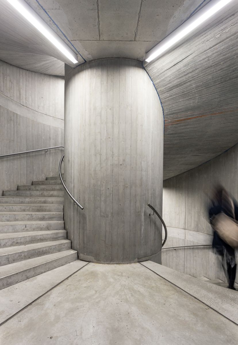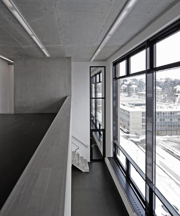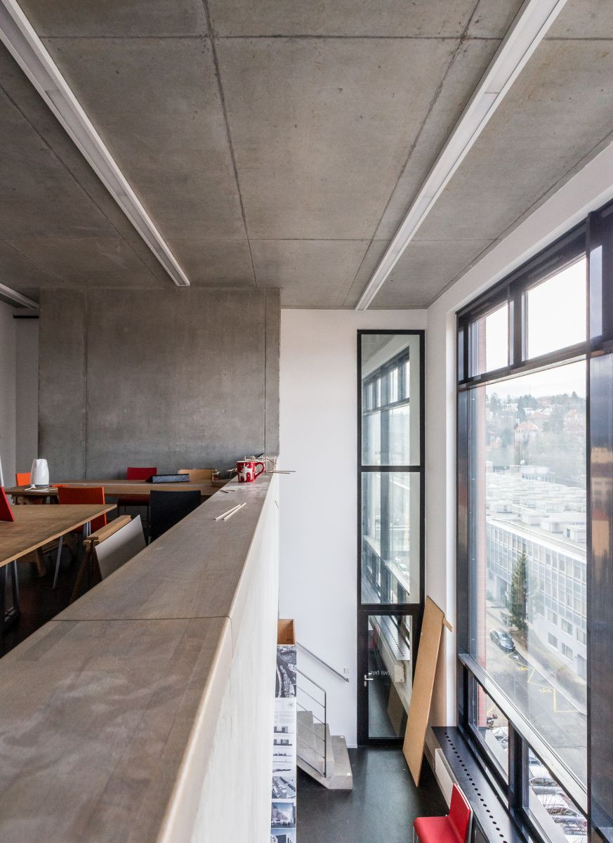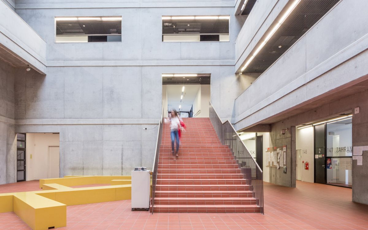 Solidní materiály nevyžadující extra péči určují výraz budovy hlavně v interiéru. Povrchy snesou z dlouhodobého hlediska téměř vše – na to krátkodobé upozornili autoři návrhu studenty už ve svém provolání, jak se k budově mají chovat.