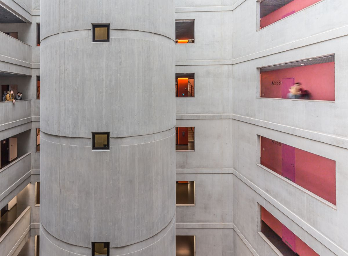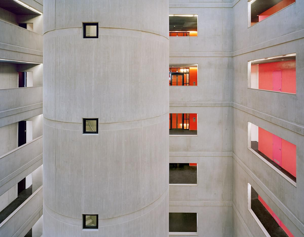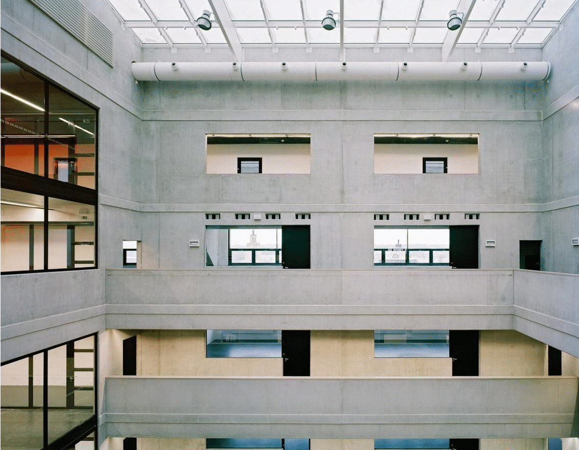 Solidní materiály nevyžadující extra péči určují výraz budovy hlavně v interiéru. Povrchy snesou z dlouhodobého hlediska téměř vše – na to krátkodobé upozornili autoři návrhu studenty už ve svém provolání, jak se k budově mají chovat.