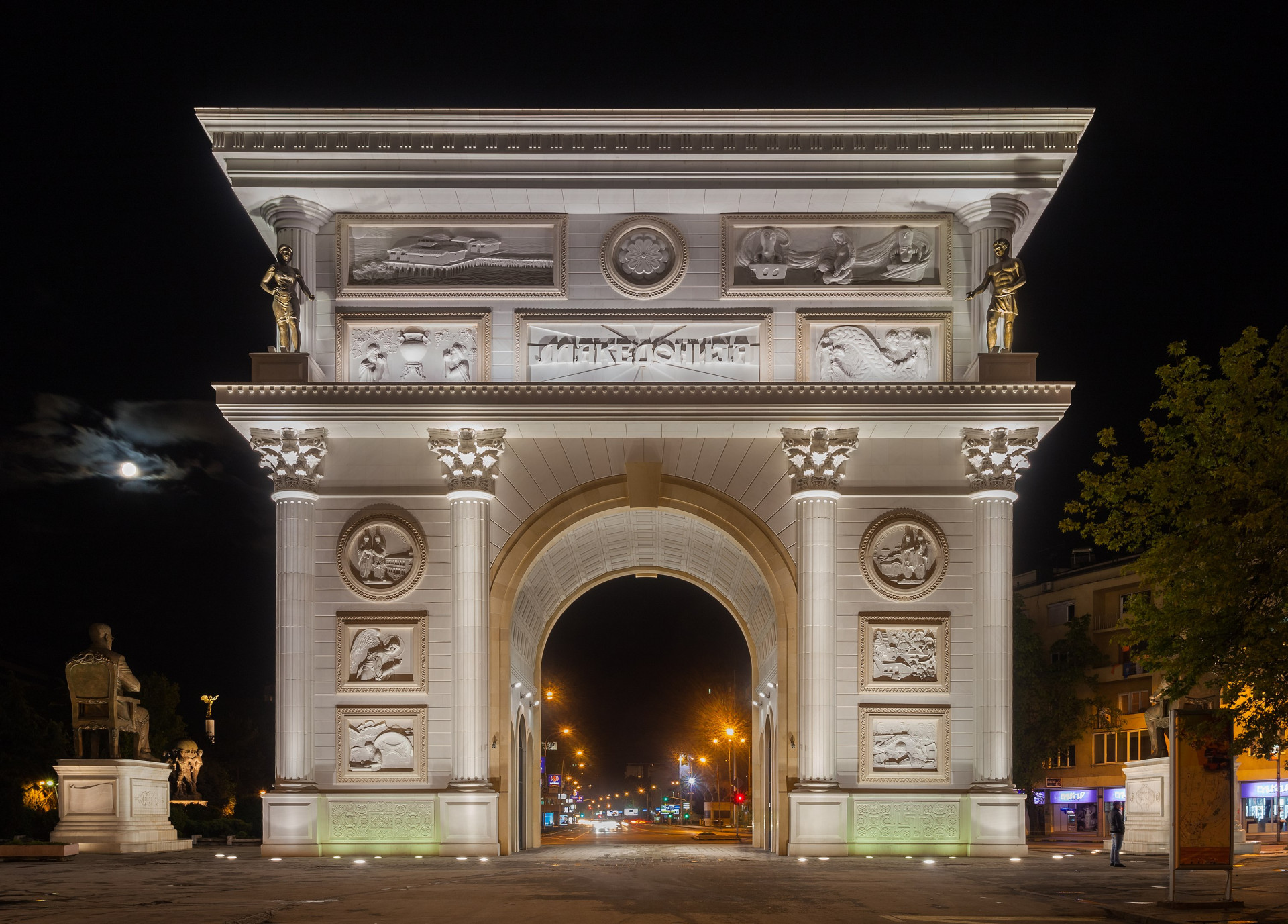 Snaha o vytvoření obrazu „ideální historie“ odkazující k dědictví Alexandra Makedonského měla podle Gruevskiho přilákat do Skopje davy turistů. Ahistorické pokusy přivlastnit si kult alexandrijského mýtu ale ještě více rozdmýchaly spory se sousedním Řeckem. Dalšími politickými přešlapy, které projekt provázely, je popírání osmanského dědictví, ke kterému se hlásí albánská menšina nebo centralizace veškerých podobných investic do hlavního města. Zpolitizovanost celého projektu a jeho nacionalistický charakter nejlépe ilustruje vítězný oblouk Porta Makedonija. Ten neoslavuje žádné konkrétní vítězství, je na něm ale deska s citátem Matky Terezy „NEJVĚTŠÍM NEBEZPEČÍM PRO SVĚTOVÝ MÍR JE POTRAT!!!“.