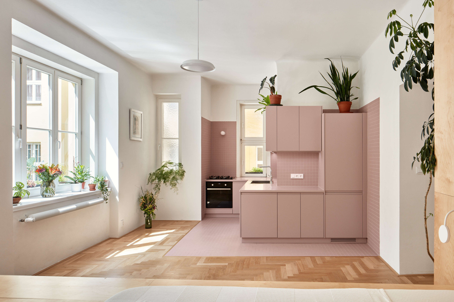 Barbie by mohla bydlet třeba na Žižkově, v bytě od studia Neuhäusl Hunal, kde jsou růžové obklady a dlaždice v kuchyni, chodbě i koupelnách. Měla by v něm dostatek úložného prostoru na všechny svoje šaty i kolečkové brusle. (Žižkovský byt 2+1, Neuhäusl Hunal, 2022)
