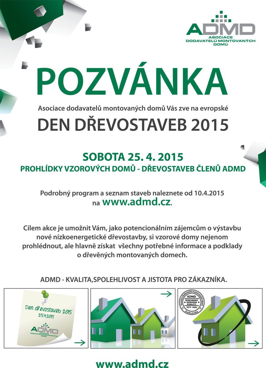 V sobotu 25. dubna se od 10.00 hodin v rámci akce Den dřevostaveb otevře v celé České republice kolem 30 vzorových a referenčních domů členů Asociace dodavatelů montovaných domů (ADMD). Den otevřených dveří tuzemských dřevostaveb se tak stane pro širokou veřejnost vhodnou příležitostí seznámit se s kvalitními a moderními nízkoenergetickými domy na bázi dřeva, s jejich konstrukcí, vlastnostmi a se samotnou technologii výstavby.