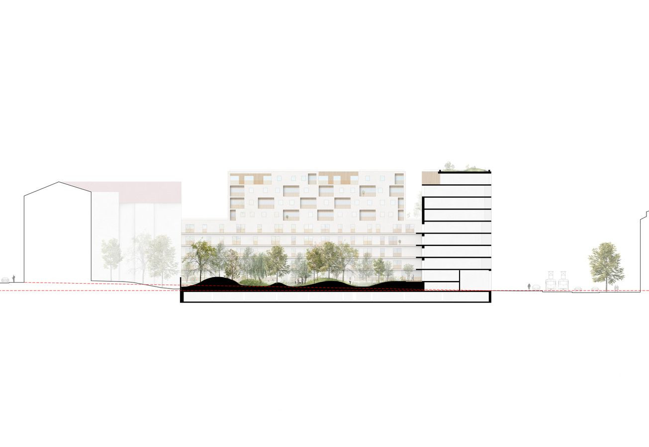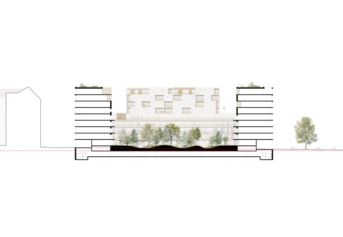 „Residence se může pomyslně nadechnout a otevřít,“ doplňuje další z autorů Linda Boušková, „Odlehčením hmoty v nároží jsou byty prosluněny a poskytují kvalitní výhled do zeleného vnitrobloku a do okolí.“ Návrh počítá také s prostorem pro kavárny, obchody nebo coworking. Dům vytváří živý blok, který plně odpovídá významu a potenciálu lokality.