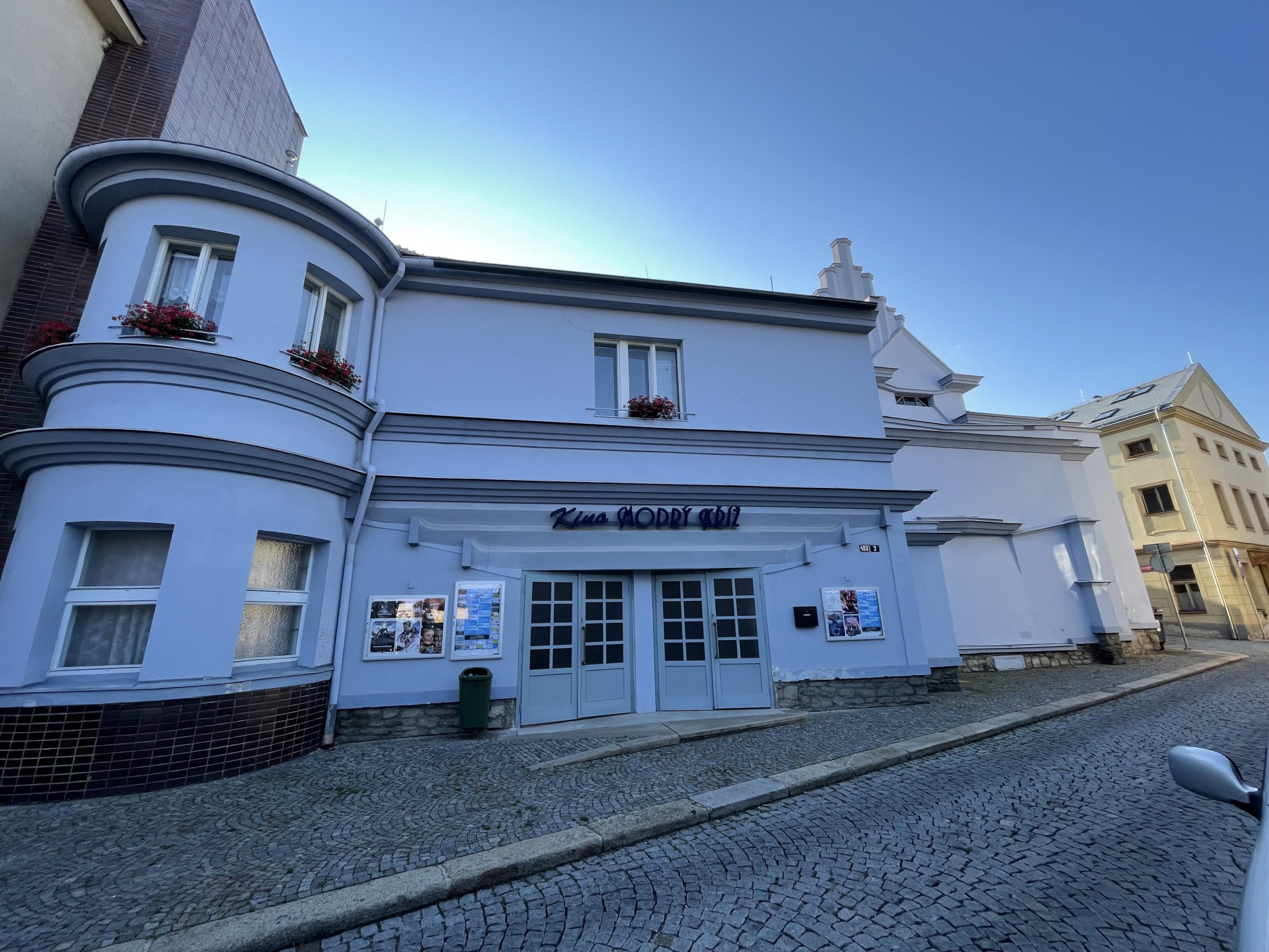Doporučuji si chvíli prohlížet také místní kubistický počin mladých architektů Pražáka a Moravce, který pomohl odstartovat jejich úspěšnou kariéru. Vedle originálně řešeného vstupu autoři kladli důraz na ustupující promítací sál. Jeho fasáda členěná lomenými tvary vrcholí expresivně tvarovaným štítem.