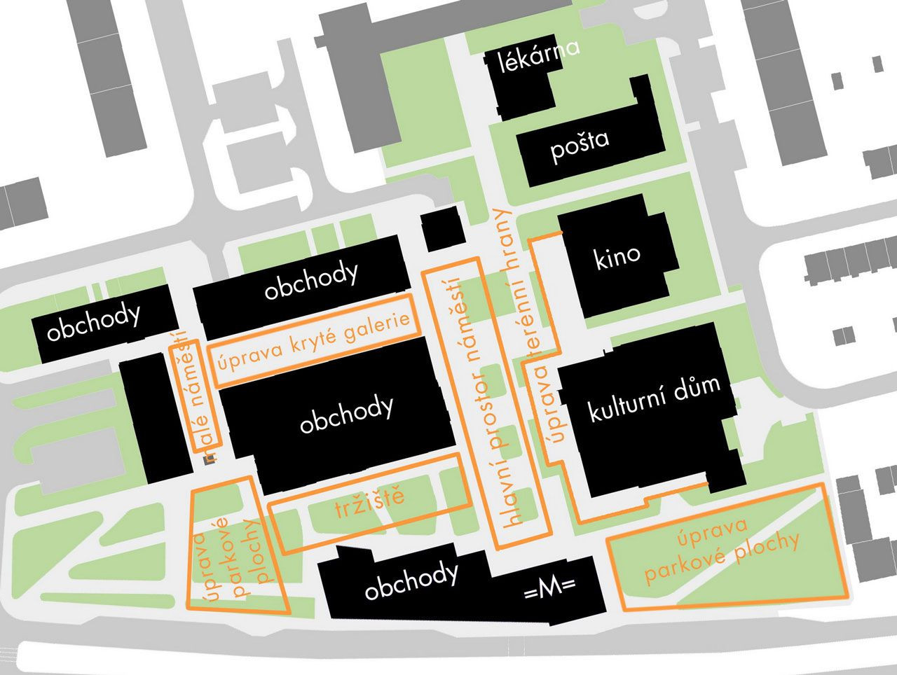 Cílem je vytvoření živého a příjemného prostoru pro každodenní život. Volná flexibilní plocha náměstí bude umožňovat celou škálu aktivit od běžného všedního setkávání a krátkodobého pobytu až po nejrůznější společenské, kulturní či sportovní akce. Letní aktivity mohou expandovat z interiérů budov do volného prostranství náměstí. Ve vymezené části řešeného prostranství mezi obchodním centrem a stanicí metra bude vytvořena plocha pro konání pravidelných trhů.