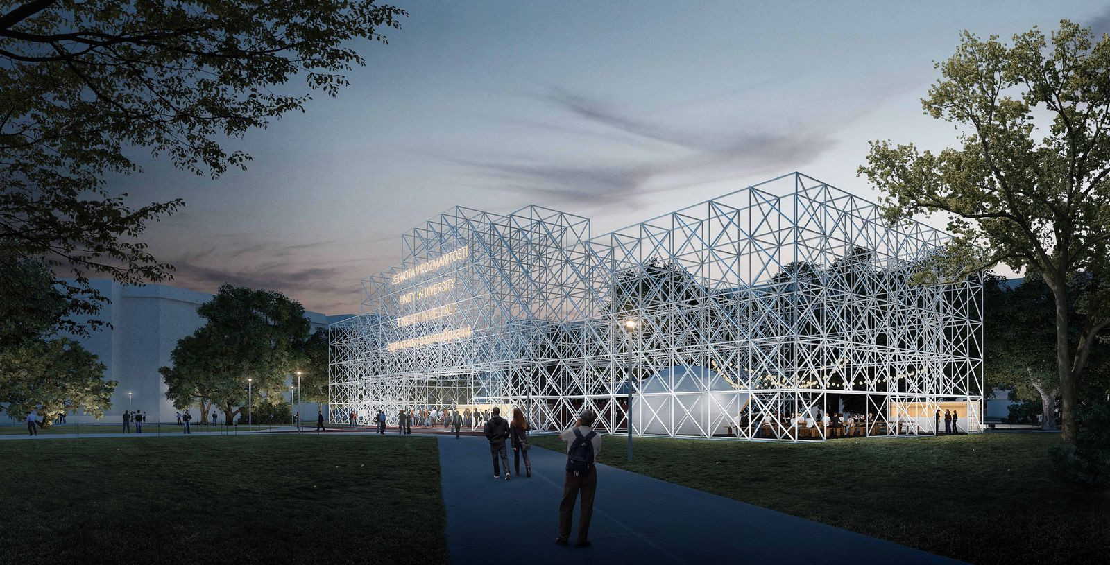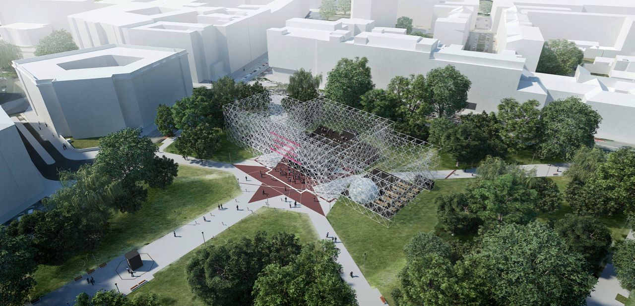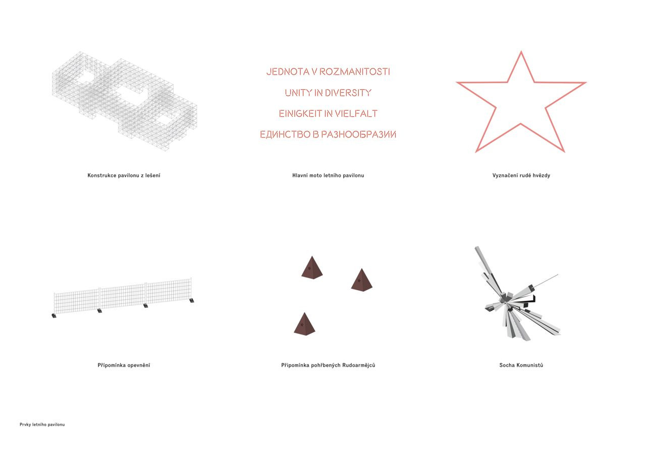 Zadáním bylo vytvořit letní pavilon, který v sobě bude obsahovat pódium, bar, pivní terasu a venkovní galerii s potřebným zázemím. Rozvržení jednotlivých funkcí v prostoru vychází z půdorysného schématu Německého domu, který je znázorněn formou struktury z lešenářských trubek; nápis umístěný na hlavním průčelí hrdě oznamuje hlavní motto festivalu – Jednota v rozmanitosti – v jazycích všech národů, které se v prostoru Moravského náměstí objevily. Střední část pavilonu slouží jako pódium, v pravém křídle jsou umístěny bar a pivní terasa, v levém křídle je venkovní galerie s expozicí výtvarných děl. Centrálnímu prostoru vévodí rudá hvězda provedená nátěrem na chodník, odkaz na sousoší komunistů je dílem sochaře Pavla Karouse. V hlavní ose náměstí směřující do centra města jsou instalovány betonové jehlany jako připomínka padlých rudoarmějců. Nejstarší vrstva – městské hradby – je převedena do formy jednoduchého plotu. Vše doplní informační tabule s popisem jednotlivých fragmentů.