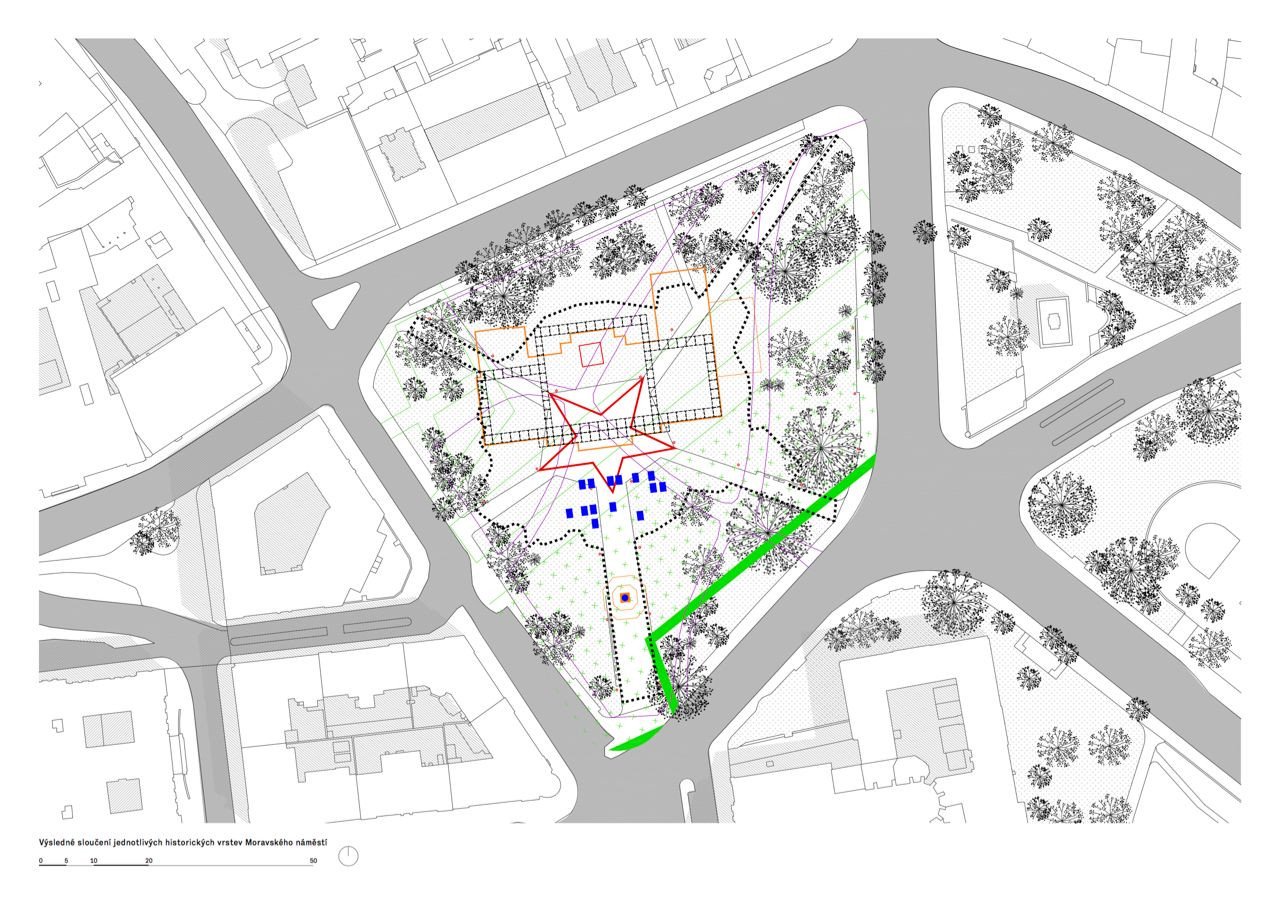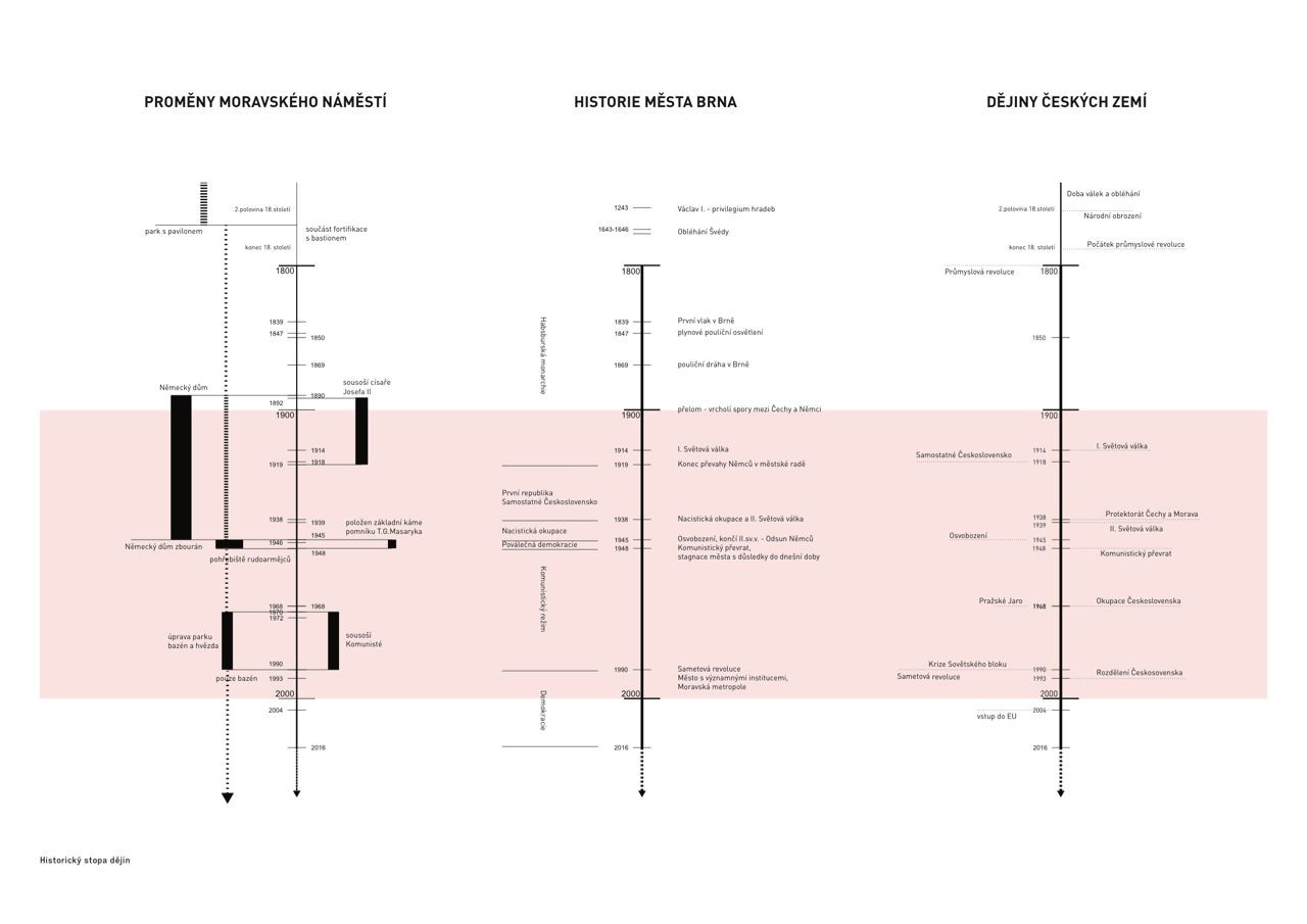 Moravské náměstí v Brně je místem s bohatou historií. Nachází se na severním okraji historického jádra města a až do poloviny 18. století bylo součástí městského opevnění s bastionem. Na konci 18. století již bylo živým místem společenského dění a po vybourání hradeb po roce 1850 se začlenilo do zeleného prstence brněnské okružní třídy. V letech 1888–1891 byl uprostřed parku vybudován Německý dům doplněný sousoším císaře Josefa II., jenž sloužil jako kulturní centrum pro německy mluvící občany Brna. Pomník byl v roce 1919 odstraněn a Německý dům zanikl s koncem 2. světové války. Po válce zde byli krátce pohřbeni rudoarmějci, kteří položili své životy při osvobozování Brna, následně byl prostor parkově upraven. V roce 1946 byl v parku odhalen základní kámen pro pomník T. G. Masaryka, který však nikdy nebyl dokončen. V letech 1970–1973 bylo prostranství znovu upraveno v duchu tehdejší ideologie – v jeho středu byl umístěn pěticípý bazén s vodotryskem a za ním sousoší Komunisté. Po roce 1990 zůstal jen bazén. Všechny tyto historické vrstvy jsou otiskem dějin nejen města Brna, ale celého českého státu. Dokumentují dramatické změny ve společnosti, jež byly hybatelem většiny změn v prostoru náměstí. S trochou nadsázky lze říci, že Moravské náměstí je skrytým manifestem naší historie.