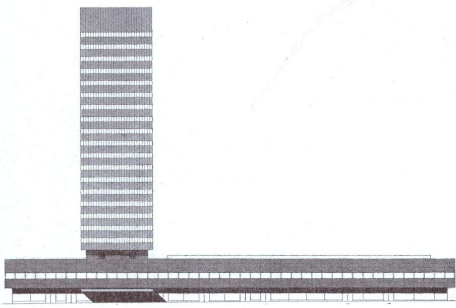 Horizontální část budovy pracuje s vnějším pláštěm podobně, přesto je ale kontrast mezi vertikálou hotelu a horizontálou terminálu podpořen použitím jiných materiálů na fasádě – po celé délce stavby se pne nepřerušený pás oken, který rozbíjí pruhy z šedozelených smaltovaných ocelových plátů. Díky odstoupenému přízemí působí stavba z úrovně ulice lehce. Aby pak celý projekt lépe zapadl do svého prostředí, odpovídá výška horizontální budovy okolní zástavbě.