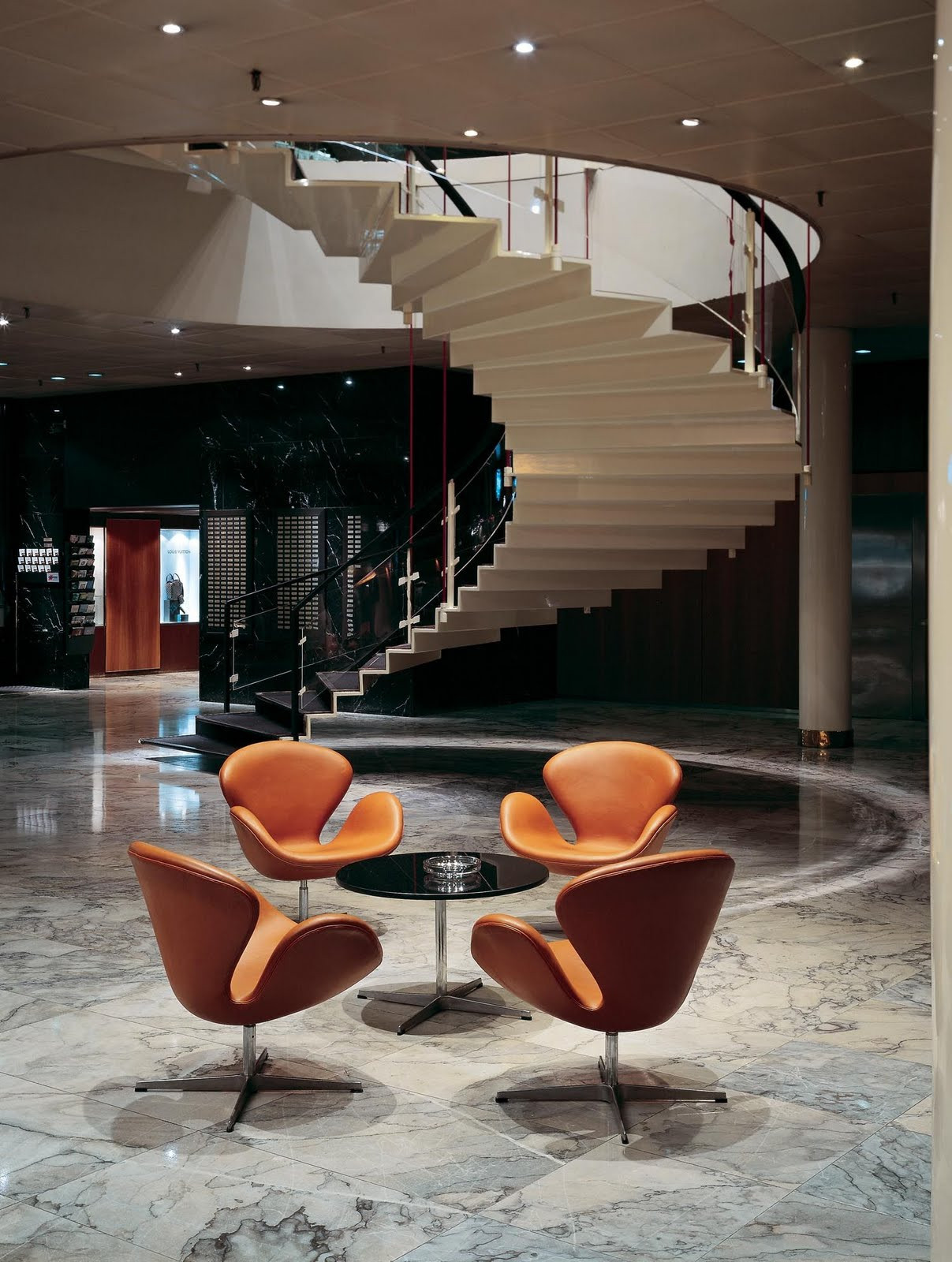 Arne Jacobsen tak stavbu pojal jako přehlídku sofistikovanosti a unikátních řešení. Téměř nepoužíval prefabrikované nebo tovární výrobky a veškerý interiérový design hotelu vyprojektoval sám. Stavba získala několik výrazných prvků, mezi které patřil například prostor recepce a restaurace, kterému vévodily mramorové stěny nebo zavěšené točité schodiště mezi přízemím a prvním patrem. Schodiště Jacobsen promyslel do posledního detailu, a to včetně zábradlí potaženého kůží. Za skleněnými vitrínami recepce vznikla dokonce dvojúrovňová zimní zahrada osázená orchidejemi.