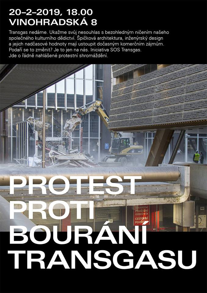 rádi bychom vám oznámili konání protestní akce u proti začínající demolici areálu budov Transgas, ve středu 20. února 2019 od 18:00 na Vinohradské třídě u Transgasu. Chceme vyjádřit svůj nesouhlas s devastací architektonicky a technicky hodnotných budov, které jsou důležitou součástí vrstevnatého historického obrazu města Prahy. V místě natolik důležitém pro dějiny našeho státu, v bezprostřední blízkosti Václavského náměstí, Národního muzea a Českého rozhlasu i Federálního shromáždění, které se oprostilo od své politické funkce a stalo se kulturní institucí, bylo vyhrazeno místo pro strategickou stavbu dispečinku mezinárodního plynovodu. Areál vznikl s hlubokým pochopením významu místa. Jeho urbanistický rozvrh vytvořil fungující přechod od pravidelných vinohradských bloků k rozvolněné zástavbě v okolí magistrály a otevřenému bulváru Václavského náměstí. Budovy Transgasu náleží k nejvýznamnějším stavbám 70. let v bývalém Československu, a snesou srovnání i s tehdejší špičkovou produkcí západní architektury. Kromě českých odborníku (prof. Švácha) se za zachování Transgasu vyslovila řada zahraničních osobností – například prof. Chizzoniti (Politecnico di Milano), Ana Miljacki (Assistant Professor of Architecture, MIT), prof. Jörg Haspel (prezident německého komitétu ICOMOS), prof. Marian Zervan (vedoucí Katedry Dejín a téorie umenia Trnavskej Univerzity v Trnave), Dott.Arch. Guido Carrai (Universita' di Firenze), prof. Henrieta Moravčíková (předsedkyně DOCOMOMO Slovakia), a další (vizte https://bit.ly/2BFHhDM). Dávno před vleklou debatou o památkových hodnotách Transgasu byl celý areál zanesen do závazného dokumentu Územně analytických podkladů hlavního města Prahy, jako Architektonicky cenný soubor (https://bit.ly/2Eh9GBJ)!