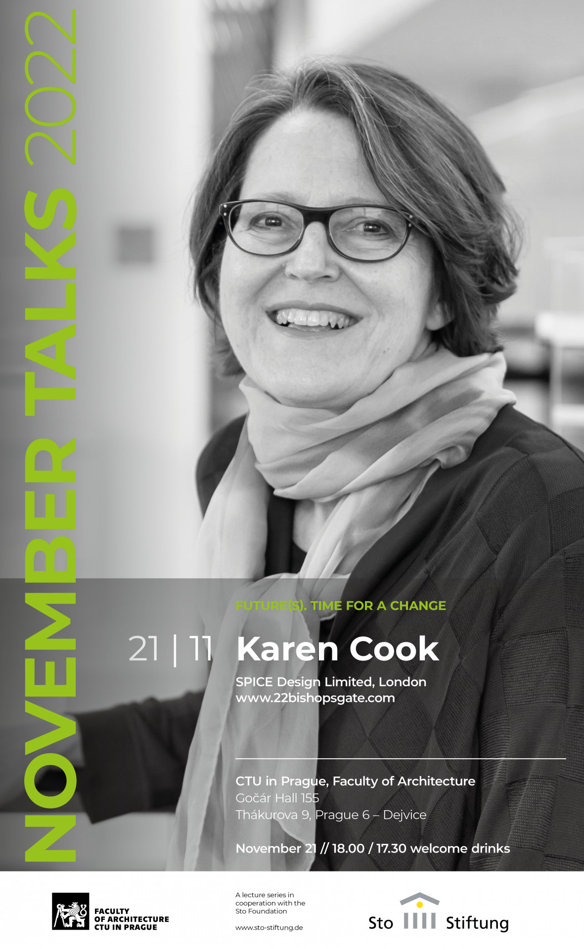 November Talks se budou konat po čtyři listopadové pondělky, vždy od 18.00 hodin – 7. 11. (Winy Maas), 14. 11. (Alice Cabaret), 21. 11. (Karen Cook) a 28.11. (Carlo Ratti) – v posluchárně 155 Gočár / 105 Kotěra (Winy Maas), Fakulta architektury ČVUT, Thákurova 9, Praha 6.