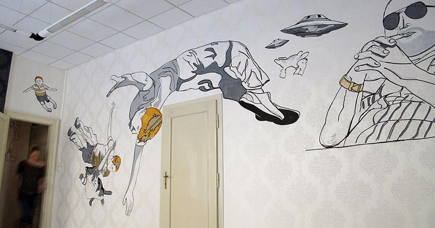 Může k Vám klient přijít s konkrétní představou třeba o barvách, motivu, velikosti, stylu atd. a chtít po Vás jen „výrobu" walldesignu, nebo si v tomto směru ponecháváte volnost? Ano, již jsem několikrát musel klienta odmítnout, protože byly jeho představy natolik konkrétní, že mě to zcela svazovalo. Takže zakázky typu „nemohl byste nám do dětského pokojíčku namalovat něco od Disneyho" s prominutím nedělám. Ale jinak považuji účast klienta na procesu za důležitou a nezbytnou. Není přece možné, aby se klient poprvé seznámil s motivy pro walldesign, až když jsou namalované na zdi. Takže je to klasický proces: na začátku debaty s klientem, zjištění jeho preferencí a představ, prezentace 3-4 konceptů, rozpracování vybraného konceptu do konkrétních návrhů pro konkrétní plochy a nakonec realizace, která už nemůže nikoho překvapit. Po celou dobu je klient u toho a přitom si nechávám volné ruce a prostor pro své nápady.