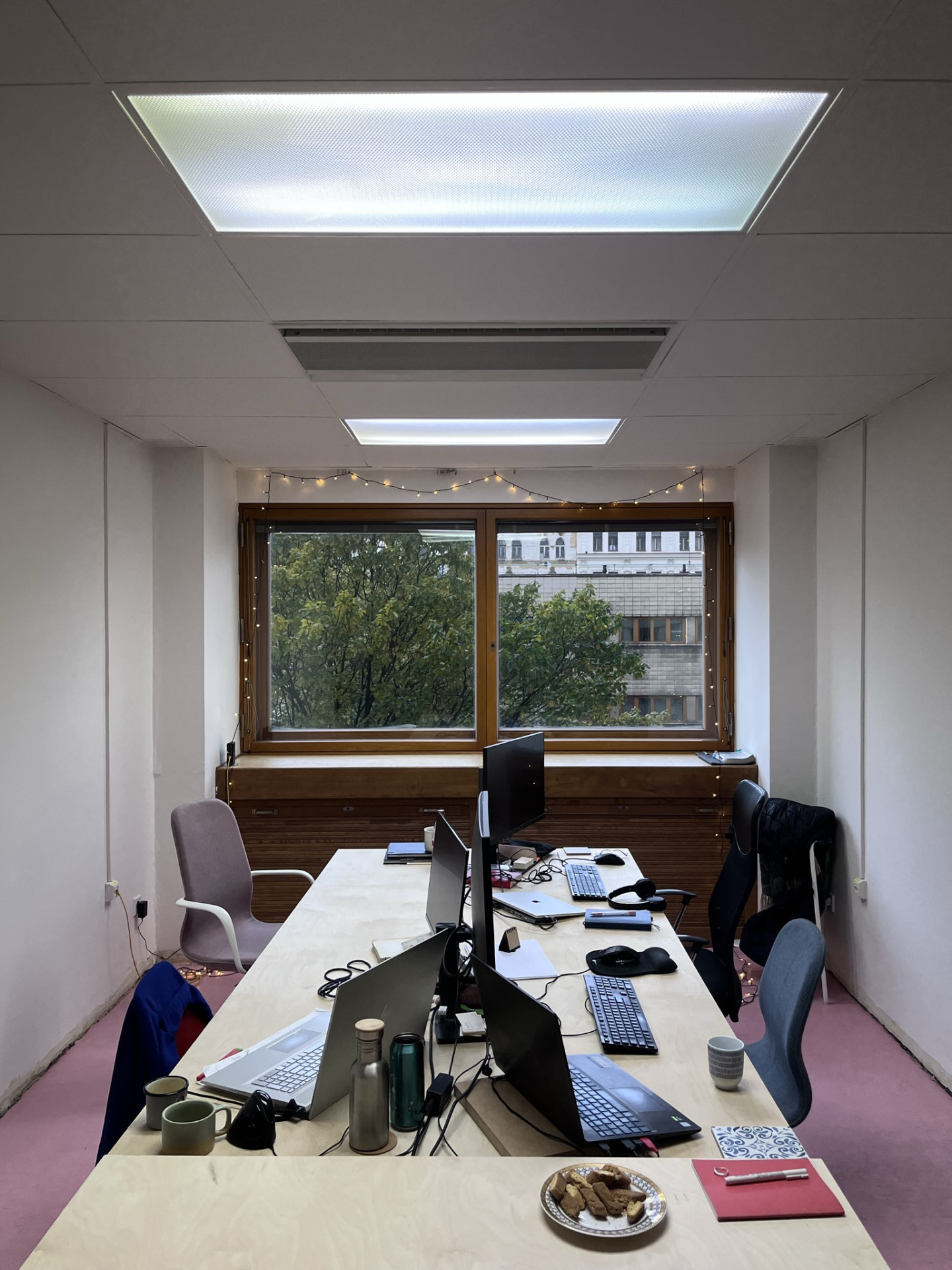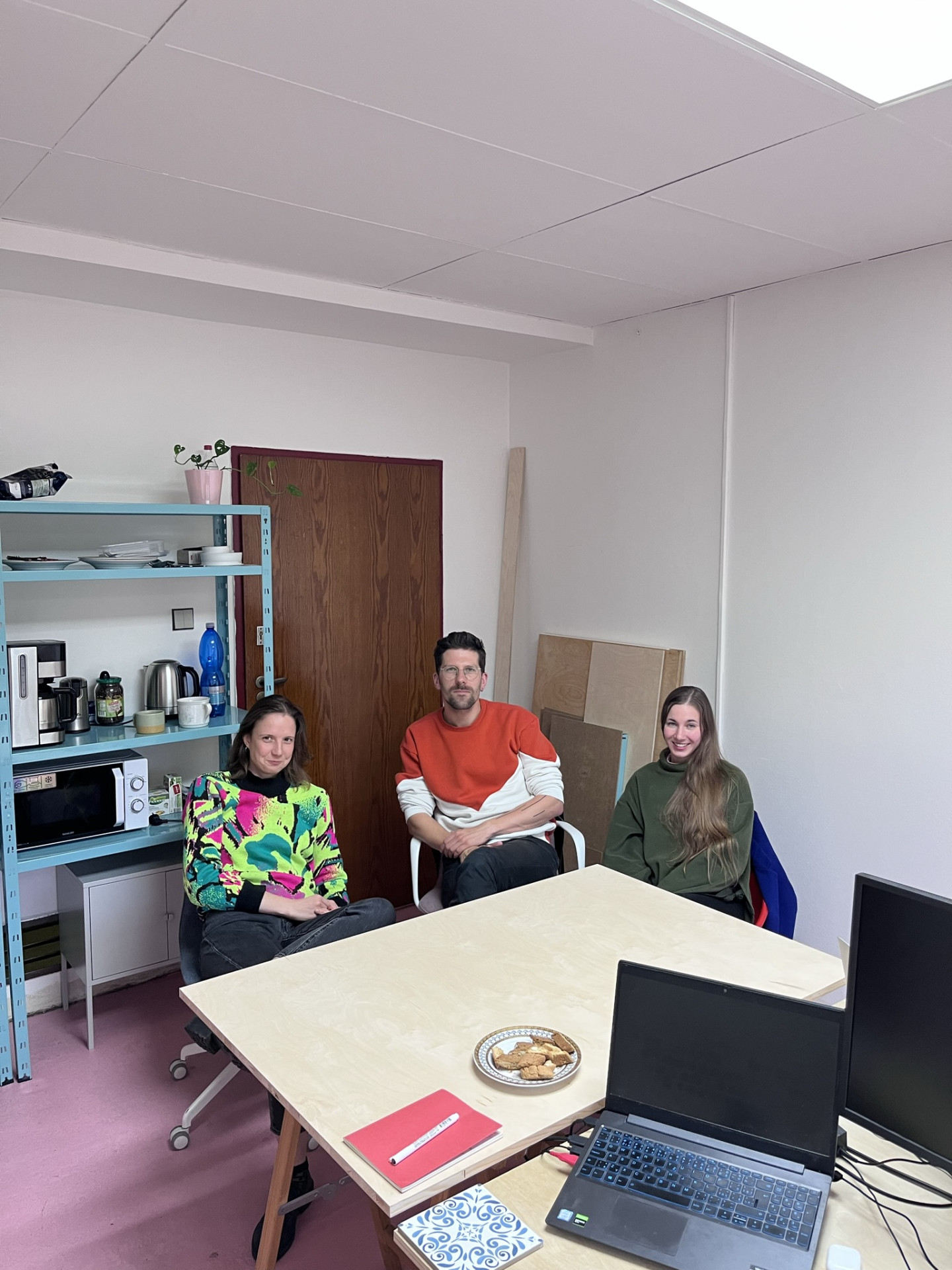 Matěj mě vyzvedá na recepci. Přicházíme do jedné z několikaset kancelářských jednotek funkcionalistického paláce, který je nyní pracovním hubem nespočtu kreativců, jež si kolektiv před několika týdny pronajal. "Jsme tady čerstvě, tak tady máme jen to nejpotřebnější a není to moc zabydlené," dodává Matěj a seznamuje mě se zbytkem - Marií a Eliškou. Chvíli hovoříme, pijeme kávu a poté se vrháme na rozhovor.
