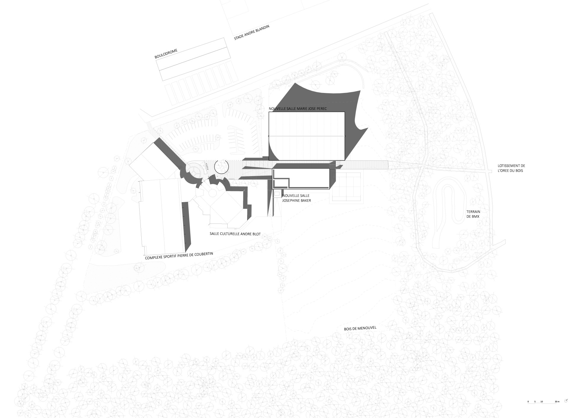 V pětitisícové bretaňské obci La Bouëxière vznikla nová budova sportovního a kulturního centra, kterou navrhlo studio onzE04 pro místní samosprávu. Dům stojí vedle stávajících sportovišť, školy a kulturních zařízení a do budoucna se počítá s další školou na sousedním pozemku. Projekt tak zapadá do širšího rozvojového území na okraji obce, které je určené pro občanskou vybavenost hlavně z odvětví sportu a vzdělávání.