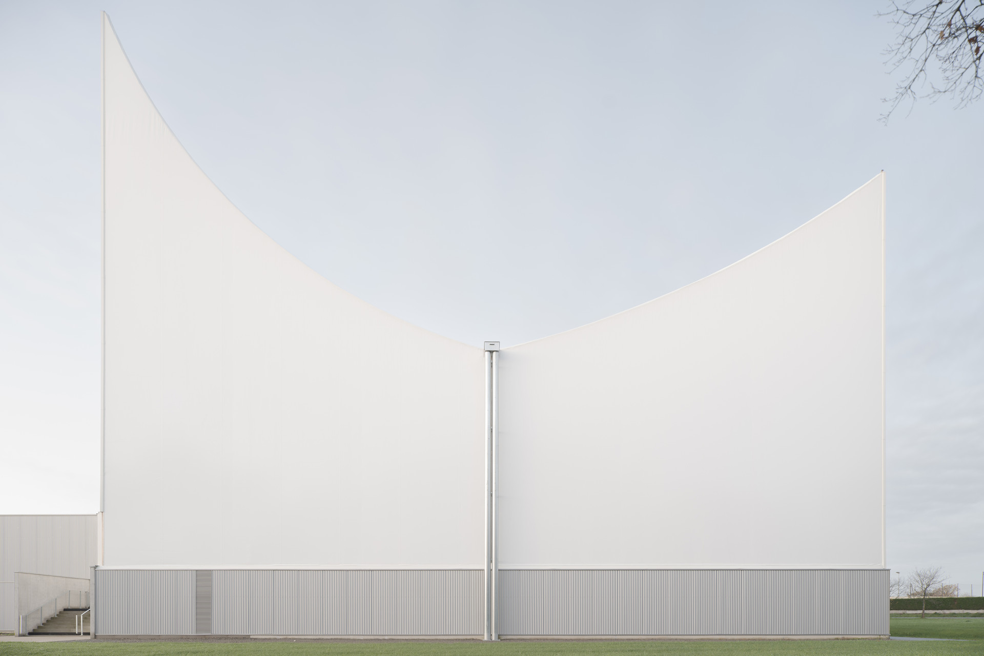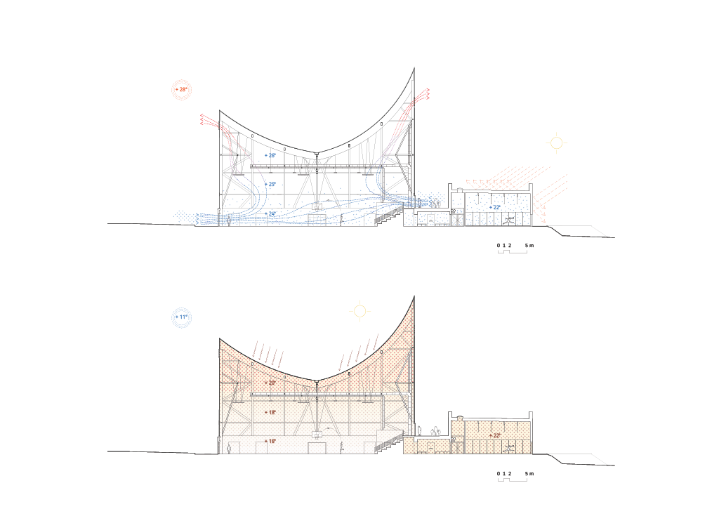 Právě rozdílné klimatické nároky se promítly do konstrukce obou částí sportoviště. Severní hala je postavená z lepeného lamelového dřeva a opláštěná textilními membránami, které propouští denní světlo a spolu s tvarem střechy zajišťují přirozené větrání. Teplý vzduch stoupá vzhůru k výrazným vrcholům střechy a odchází ven, což pomáhá udržet příjemné vnitřní prostředí bez složitých technologií. „V noci se její bílý textilní plášť proměňuje v prosvětlenou lucernu, symbolizující obnovu místa,“ popisuje vizuální efekt stavby porota ceny.