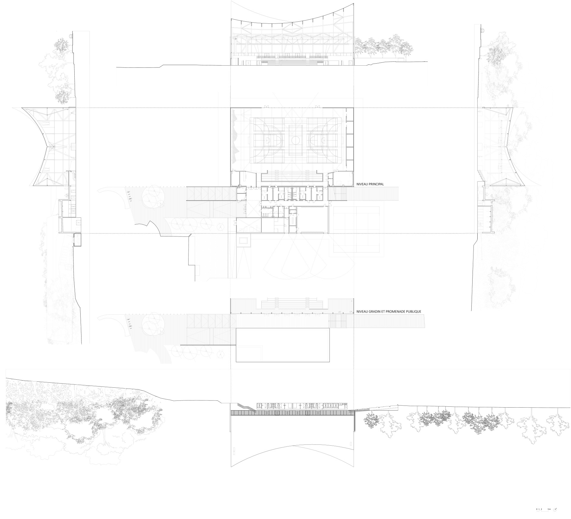 Obě části pak propojuje centrální komunikace. Má dvě úrovně – horní vede na tribuny a nabízí výhled do haly, spodní propojuje vstupní a společné prostory. „Rozděluje sportovní centrum na dva vzájemně se doplňující objemy, z nichž každý reaguje na odlišné funkční a klimatické požadavky,“ uvádí porota EU Mies Award.