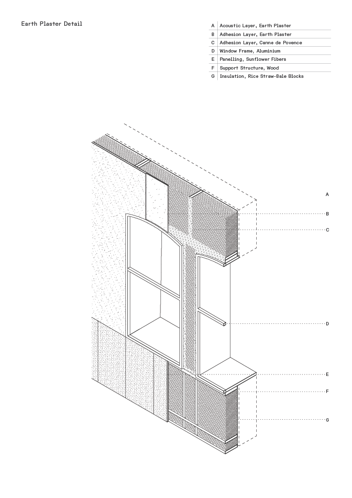 Na výzkumu materiálů pracovalo LUMA Studio přímo na místě. Spojili se s BC Architects, což je belgický ateliér, který se rovněž věnuje výzkumu přírodních materiálů a experimentálním stavbám z nich. Na místě testovali řadu nových postupů. Například zdi jsou izolované balíky rýžové slámy. Ze stonků slunečnic se vytvořila zvuková izolace. Některé stěny jsou z dusané hlíny, do níž byl zapracován prach a další odpady z nedalekých kamenných lomů. Použité dřevo je ošetřené indigovým olejem. Staré cihly a tašky ze střech se využily do teraca na podlahách.