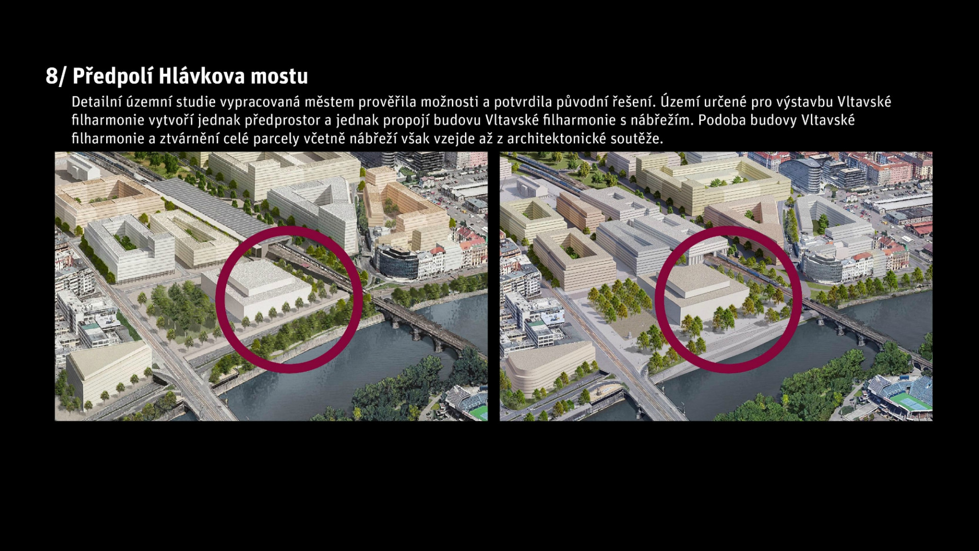 Detailní územní studie vypracovaná městem prověřila možnosti a potvrdila původní řešení. Území určené pro výstavbu Vltavské filharmonie vytvoří jednak předprostor a jednak propojí budovu Vltavské filharmonie s nábřežím. Podoba budovy Vltavské filharmonie a ztvárnění celé parcely včetně nábřeží však vzejde až z architektonické soutěže.