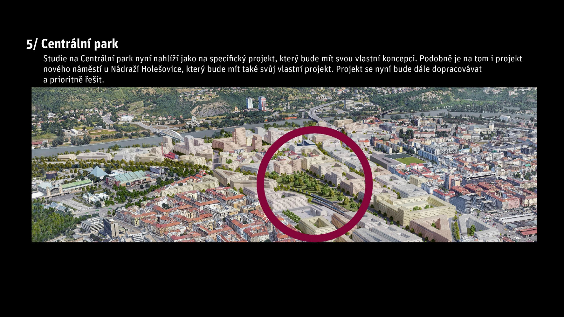 Studie na Centrální park nyní nahlíží jako na specifický projekt, který bude mít svou vlastní koncepci. Podobně je na tom i projekt nového náměstí u Nádraží Holešovice, který bude mít také svůj vlastní projekt. Projekt se nyní bude dále dopracovávat a prioritně řešit.