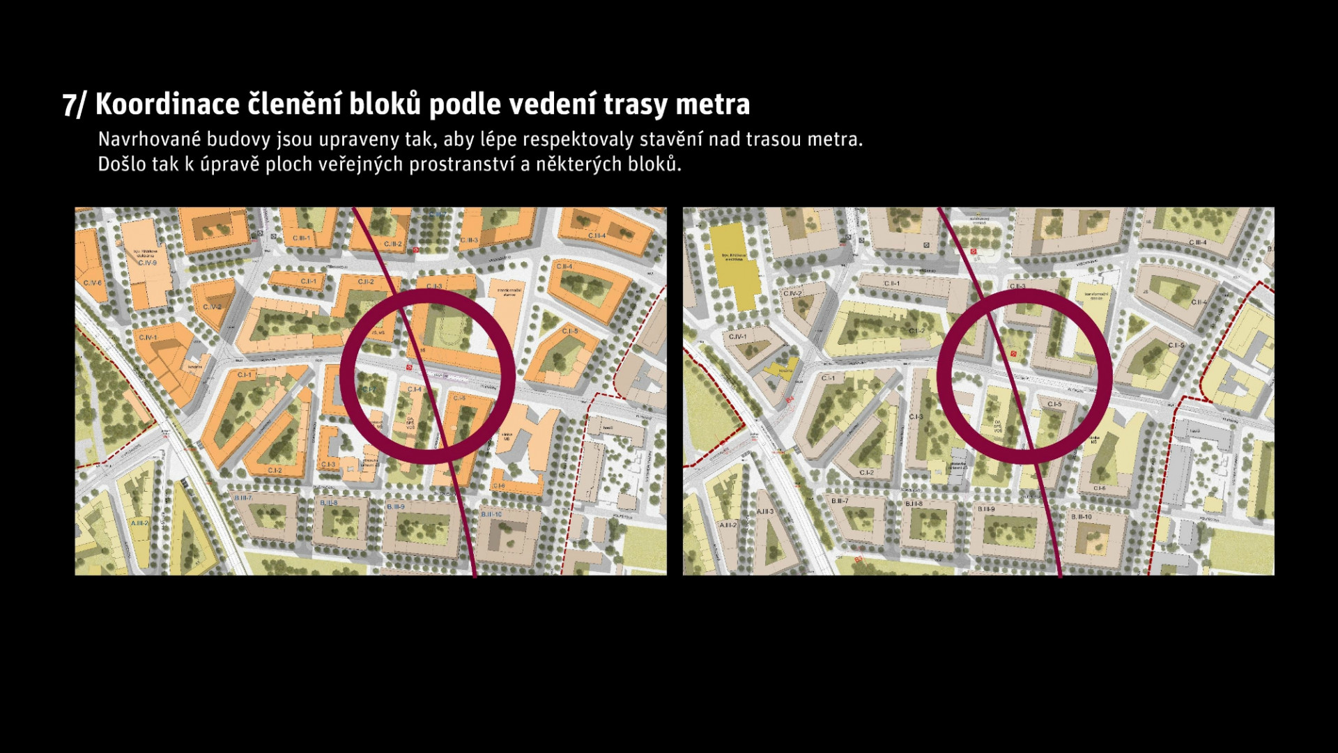 Navrhované budovy jsou upraveny tak, aby lépe respektovaly stavění nad trasou metra. Došlo tak k úpravě ploch veřejných prostranství a některých bloků.