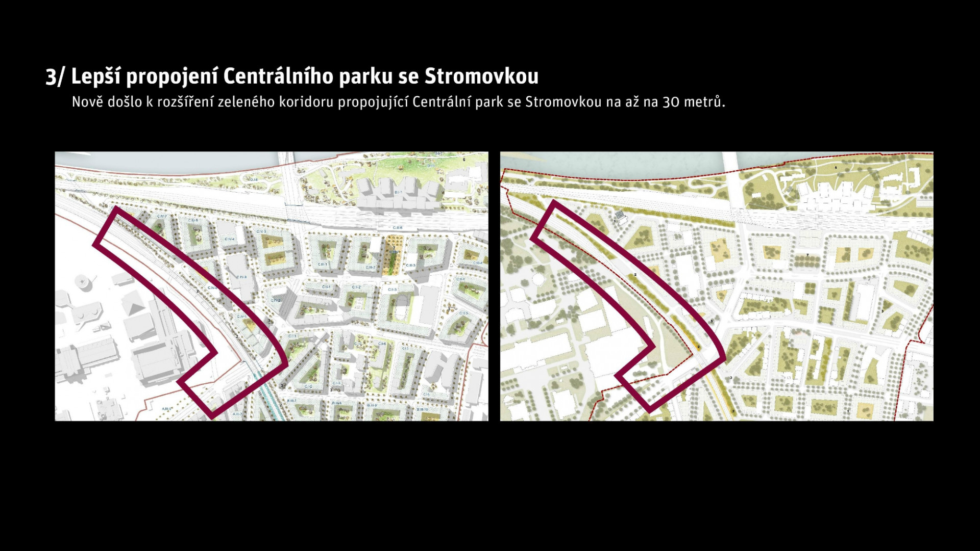 Nově došlo k rozšíření zeleného koridoru propojující Centrální park se Stromovkou na až na 30 metrů.