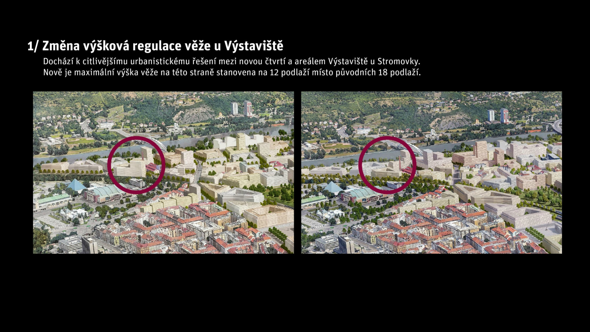 Dochází k citlivějšímu urbanistickému řešení mezi novou čtvrtí a areálem Výstaviště u Stromovky. Nově je maximální výška věže na této straně stanovena na 12 podlaží místo původních 18 podlaží.