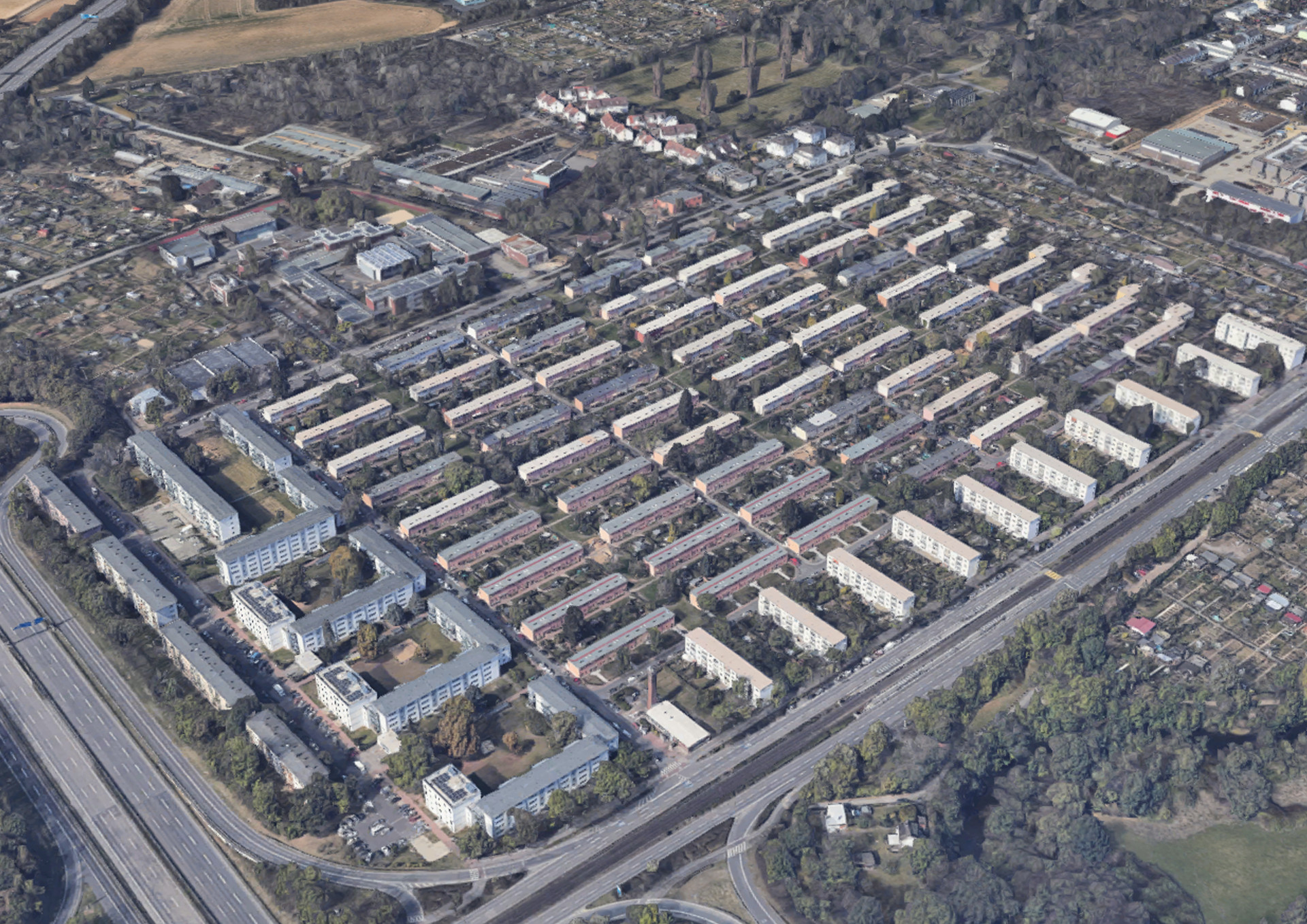 Nový Frankfurt byl koncipován jako několik decentralizovaných sídlišť na okraji města. Zvolené pozemky se nacházely ve větší vzdálenosti od centra města. Důvodem bylo, že pozemky blíže centru město nevlastnilo a jejich cena byla příliš vysoká. Ovlivněn ideami anglických zahradních měst pojal May a jeho tým tato sídliště jako kombinaci lineárních řadových rodinných a bytových domů. Bytové domy byly většinou pavlačového typu z důvodu ekonomické úspornosti.