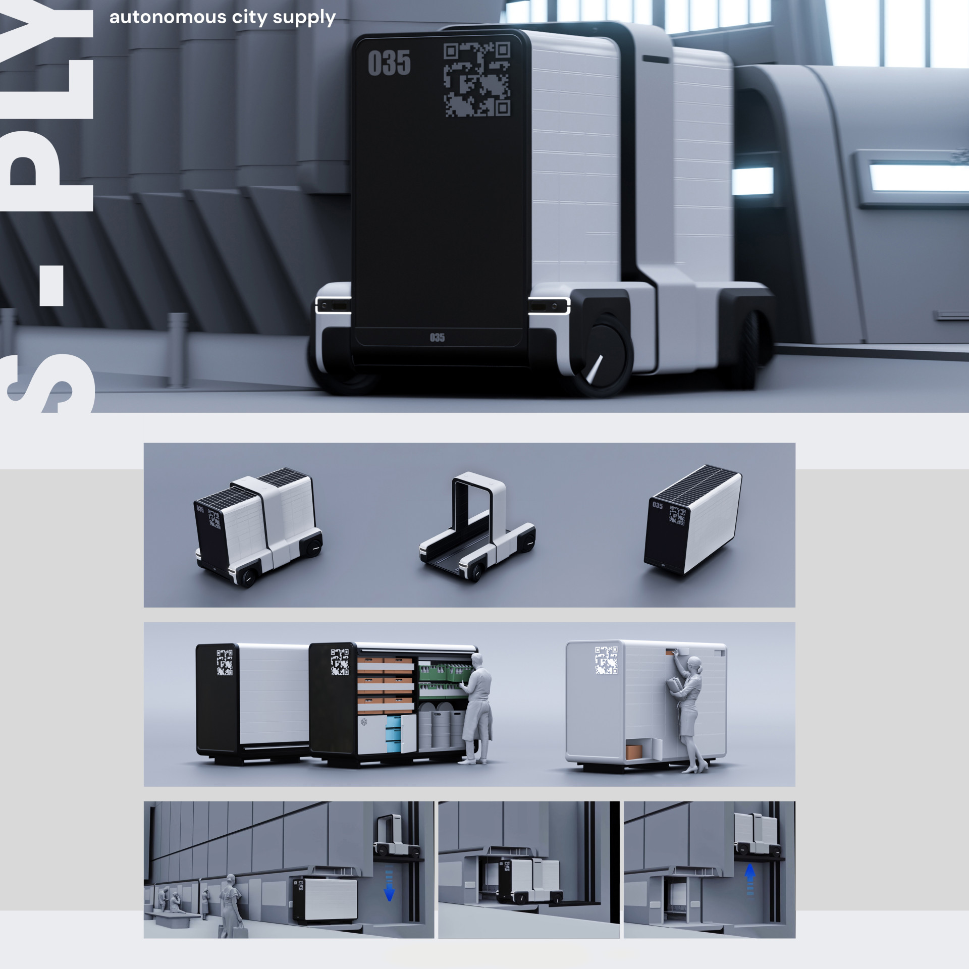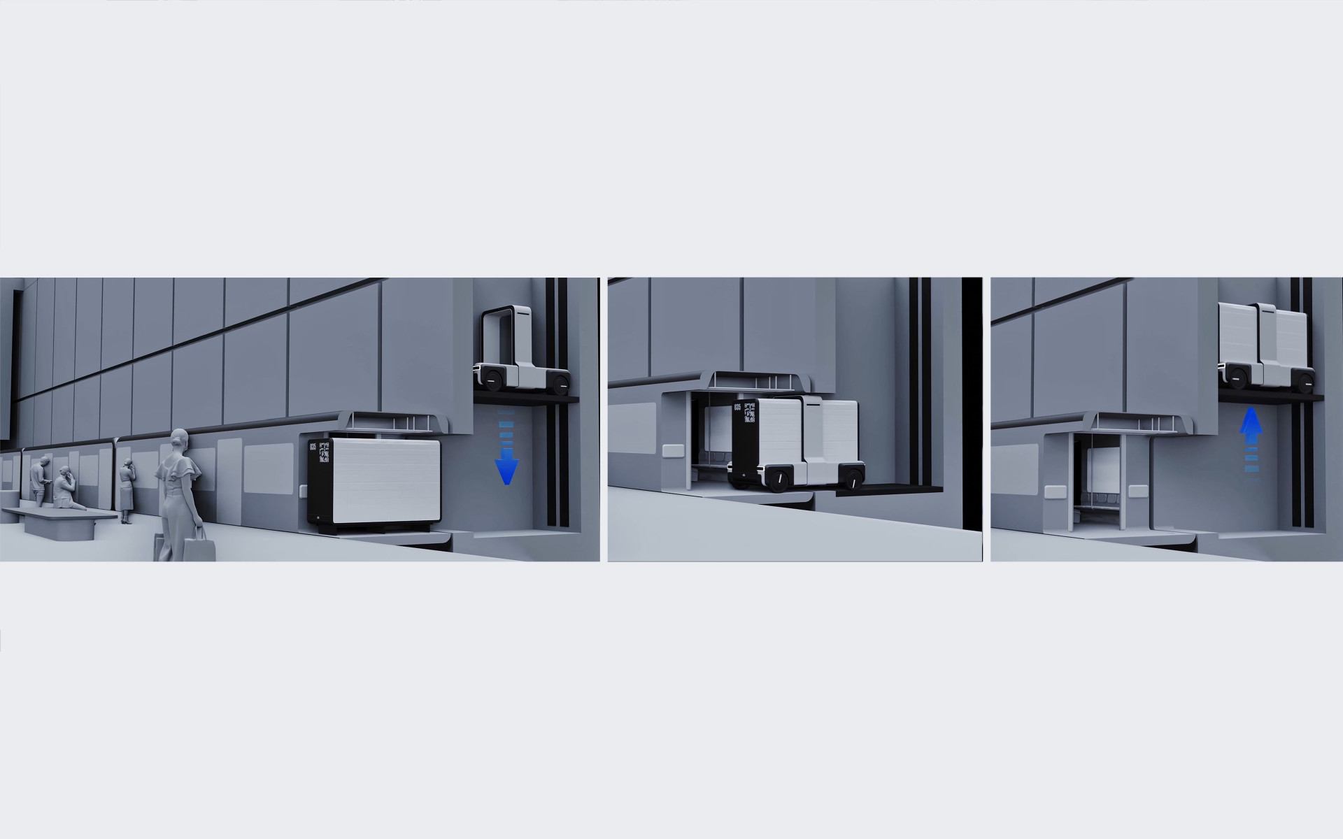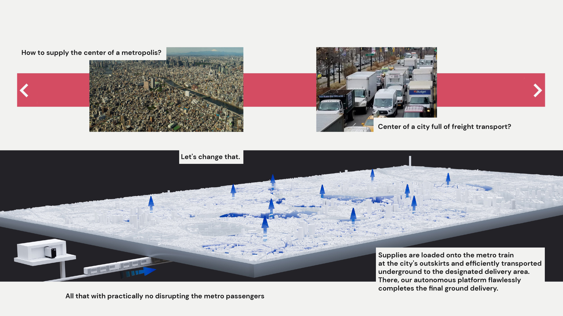 Pro nakládku zboží navrhují využití depa metra, kde dojde k naložení zásobovacích boxů do speciálního prostoru v soupravách. Mladí designéři respektují prioritu osobní dopravy, tak umístění boxů nijak neomezí přepravu cestujících. V cíli cesty, v centru města, dojde k vyzdvižení boxů autonomní platformou. Ta se z povrchu dostane samostatným nákladním výtahem umístěným na protilehlé straně nástupiště, aby nebyl omezen pohyb lidí.