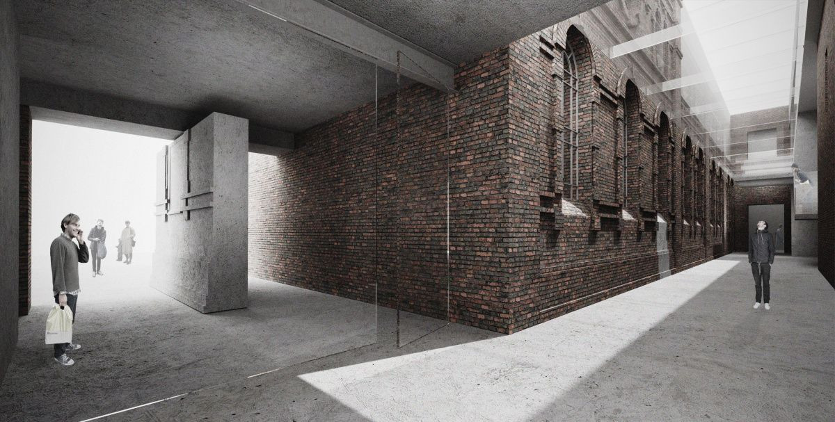 V minulosti byly cihlové zdi jatek narušeny rozměrnými otvory. Robert Konieczny ve svém návrhu přestavby plánuje tyto zásahy přiznat a otvory nahradit masivními otočnými dveřmi z betonu, které respektují dekor fasády.